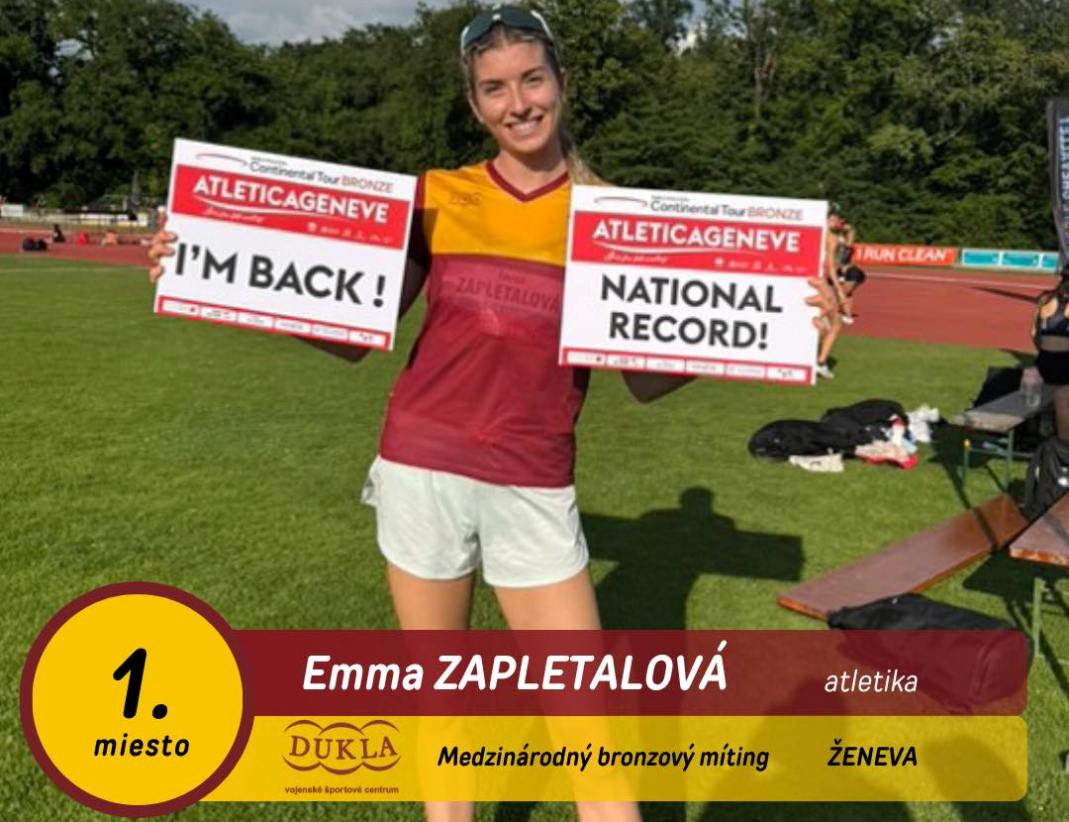 Atlétka banskobystrickej Dukly Emma Zapletalová zvíťazila na bronzovom mítingu AtleticaGeneve vo švajčiarskej Ženeve v behu na 400 m cez prekážky v novom slovenskom rekorde 54,24 sekundy. O 4 stotiny zlepšila vlastné historické maximum z 10. júla 2021 v Tallinne, kde získala titul majsterky Európy do 23 rokov.