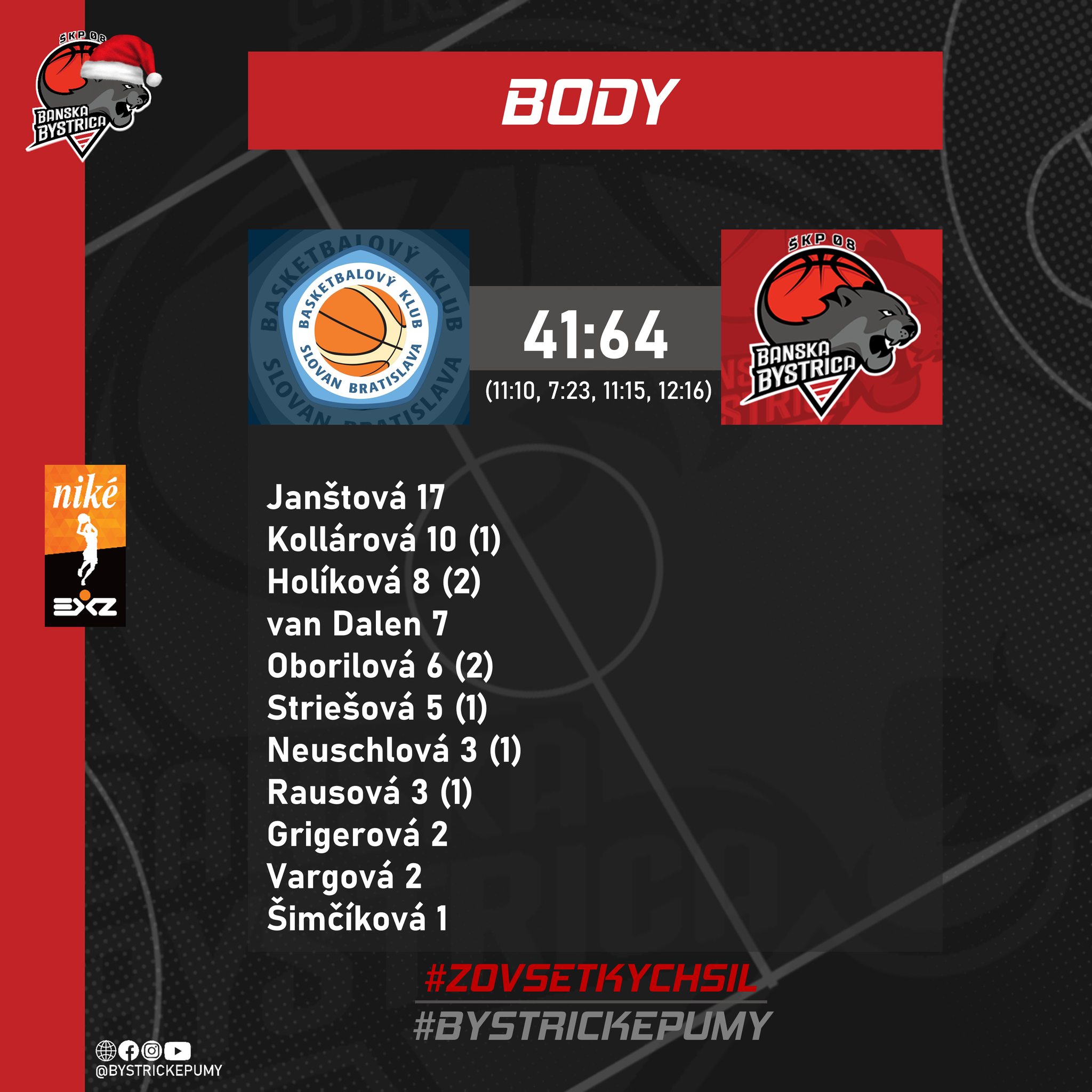 Pumy: Holíková 8 (2), van Dalen 7, Striešová 5 (1), Grigerová 2, Vargová 2 + 10 doskokov (Janštová 17 + 9 doskokov, Kollárová 10 (1), Oborilová 6 (2), Neuschlová 3 (1), Rausová 3 (1), Šimčíková 1)