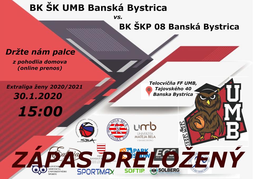 V sobotu večer 30. januára sa malo hrať v poradí už tretie basketbalové extraligové derby žien medzi našimi banskobystrickými tímami UMB a ŠKP 08. Pre Covid-19 v domácom družstve sa však duel nekonal. Náhradný termín zatiaľ nie je známy.