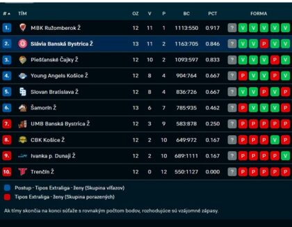 Basketbalistky Slávie Banská Bystrica ukončili v stredu večer v hale na Štiavničkách kalendárny rok súťažným extraligovým zápasom 13. kola proti Šamorínu. V prvej štvrtine sa črtalo prekvapenie, keď hostky vyhrávali o bod. Avšak v druhej desaťminútovke sa už naplno prejavila dominancia ´púm´ spod Urpína, ktorým začala fungovať obrana aj komunikácia na palubovke. Duel následne i po zmene strán dotiahli pohodlne do víťazného konca o 50 bodov – 98:48. K stovke chýbal iba jeden kôš z hry.