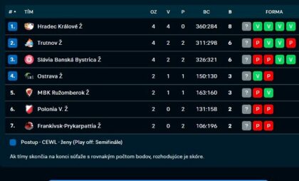Basketbalistky Slávie Banská Bystrica nezvládli ani náročný duel 4. kola CEWL proti Trutnovu. Prvá štvrtina mala vyrovnaný priebeh (19:18), obe družstvá sa opierali najmä o agresívnu obranu a vysoké tempo hry. Slávia si dokázala vytvoriť viacero streleckých pozícií, no domáce boli presnejšie spoza oblúka, čo sa ukázalo byť jedným z kľúčových faktorov zápasu. V druhej štvrtine sa Trutnov odpútal na polčasové vedenie 39:35, pričom Slávia držala krok najmä vďaka bodom Žilinskej a Urbanovej. Domáce hráčky však dominovali v kolektívnej hre – mali na konci zápasu až 22 asistencií oproti 15 bystrických.