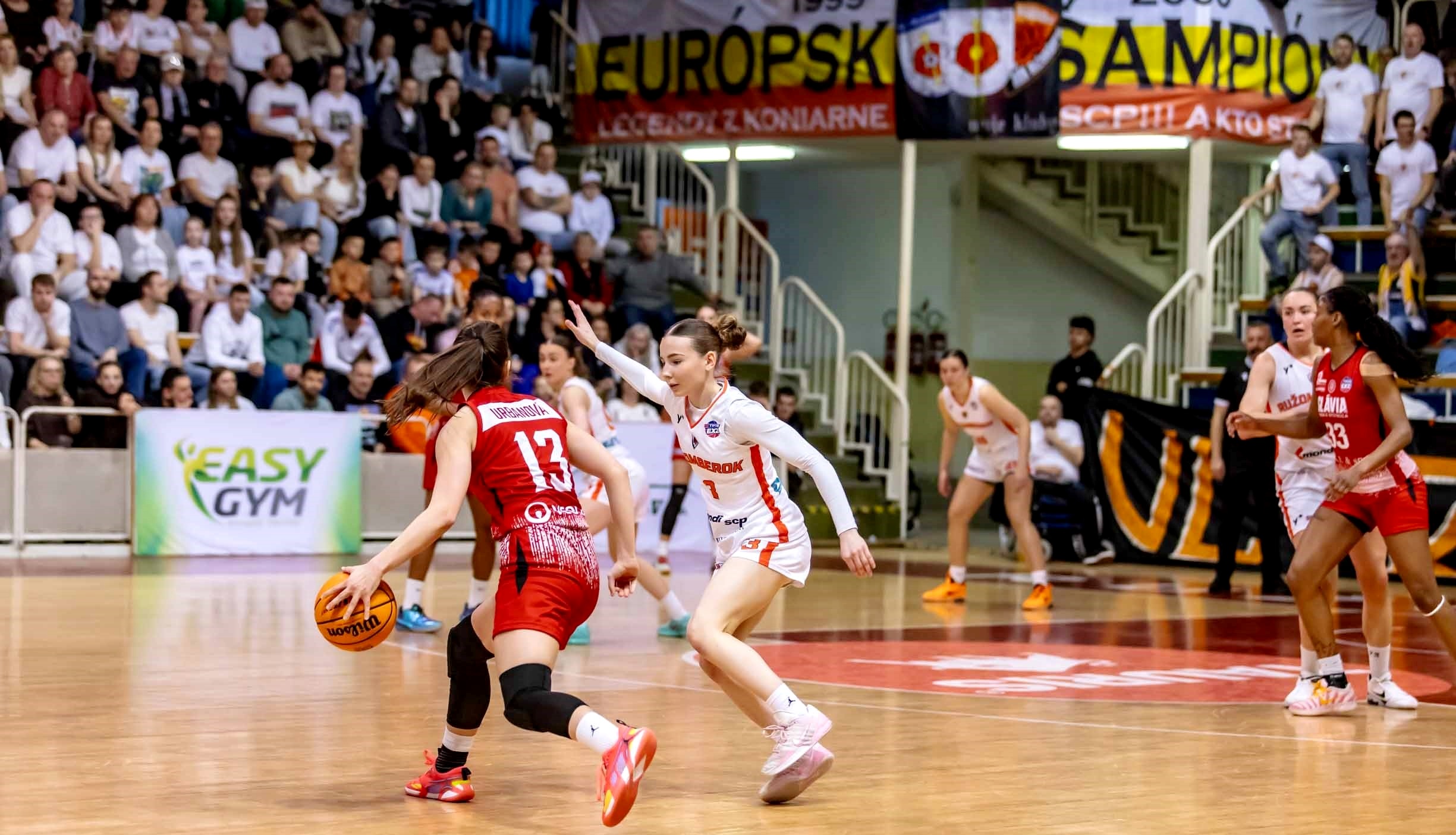 Hostky spod Urpína v úvodných jedenástich minútach ukazovali, že s návratom série na Štiavničky to myslia vážne, najprv si vytvorili päťbodový náskok, ktorý domáce odvrátili, ale väčšinu prvej štvrtiny boli vo vedení práve Slávistky, najviac o šesť bodov v 9. minúte (14:20), čo súperky korigovali okrem iných striel dvoma trojkami. Po prvej štvrtine bolo 22:24 a v 11. minúte Slávia ešte viedla (22:27), no už o dve minúty piatym úspešným trojbodovým pokusom domáce vyrovnali a 14-bodovú šnúru bez skórovania zo strany Slávie počas štyroch minút ukončili za stavu 27:36 v 17. minúte a na polčasovú prestávku odišli družstvá s rozdielom deväť bodov – 33:42.