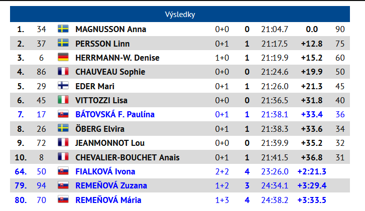 - Anna Magnussonová 21:04,7 min (0), 2. Linn Perssonová (obe Švéd.) +12,8 s (1), 3. Denise Herrmannová-Wicková (Nem.) +15,2 (1), 4. Sophie Chauveauová +19,9 (Fr.) (0), 5. Mari Ederová (Fín.) +21,3 (1), 6. Lisa Vittoziová (Tal.) +31,8 (0), 7. Paulína BÁTOVSKÁ FIALKOVÁ +33,4 (1), 8. Elvira Öbergová (Švéd.) +33,6 (1), 9. Lou Jeanmonnotová +35,2 (0), 10. Anais Chevalierová-Bouchetová (obe Fr.) +36,8 (1), … 64. Ivona FIALKOVÁ +2:21,3 (4), 79. Zuzana REMEŇOVÁ +3:29,4 (3), 80. Mária REMEŇOVÁ (všetky SR) +3:33,5 (4)