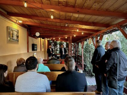 Podvečer sa centrum spomienky presunulo priamo tam, kde bije srdce „Nového Kališťa“ – do exteriéru záhrady Pohostinstva pod Čerešňou. Symbolika tohto miesta je silná, práve tu vyrástol prvý dom pre rodiny, ktoré v marci 1945 stratili strechu nad hlavou.