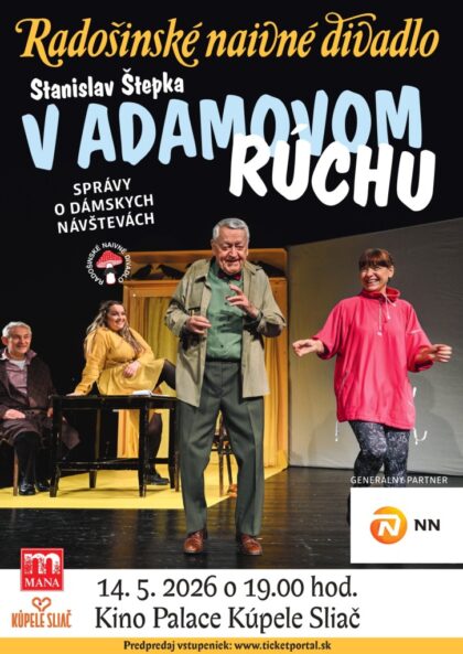 Radošinské naivné divadlo (RND) zavíta 14. mája 2026 o 19:00 hod. do Kúpeľov Sliač. V kine Palace Radošinci uvedú komediálne predstavenie V Adamovom rúchu, ktoré sa oplatí vidieť.