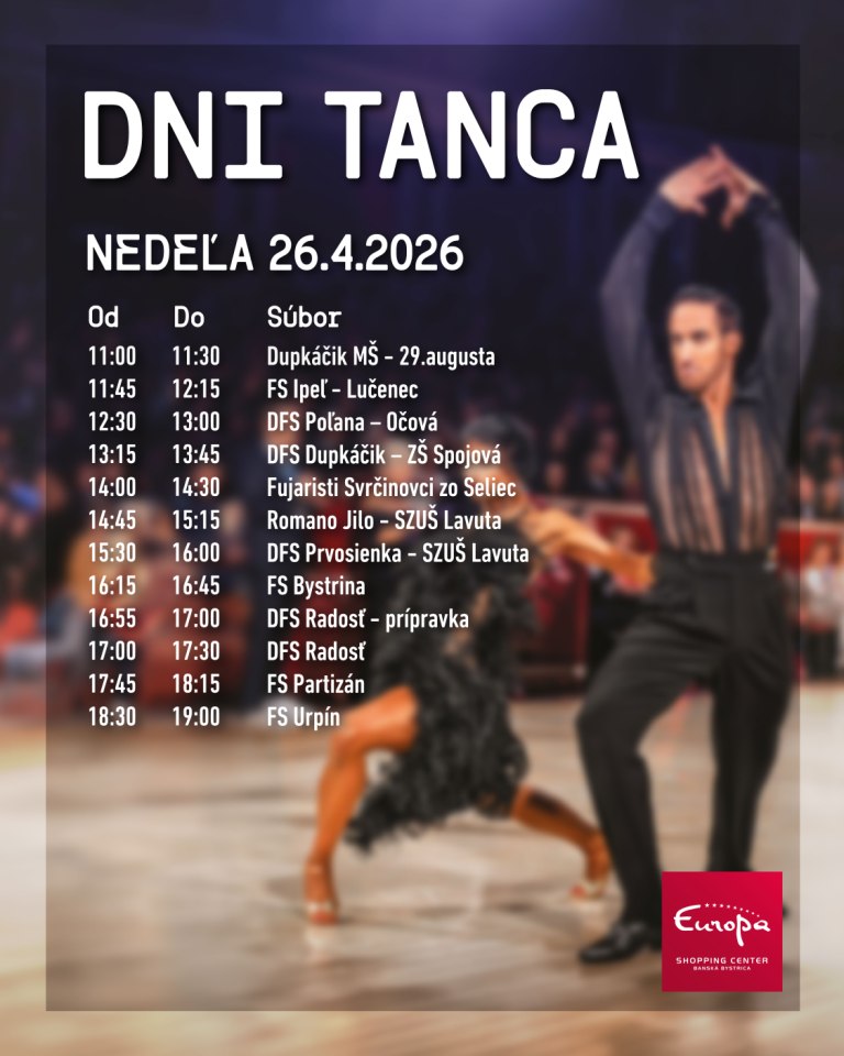 Europa SC v Banskej Bystrici sa už tento víkend premení na pulzujúce tanečné centrum, kde bude vládnuť pohyb, emócia a vášeň. Dni tanca, jedno z najväčších a najobľúbenejších tanečných podujatí v regióne, sa vracia a prinesie návštevníkom víkend plný rytmu, talentu a nezabudnuteľnej energie.