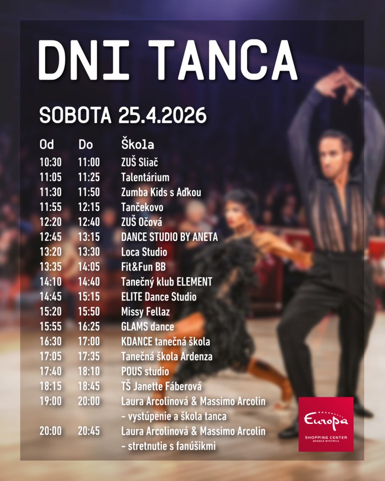 Podujatie, ktoré si každoročne získava srdcia malých aj veľkých, opäť spojí profesionálnych tanečníkov, mladé talenty aj širokú verejnosť. V dňoch 25. – 26. apríla 2026 sa Europa SC stane miestom, kde tanec rozpráva príbehy – moderné aj tradičné, dynamické aj emotívne.