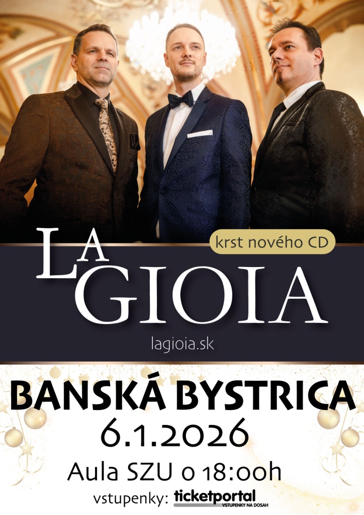 Pop-operné trio La Gioia bude mať v banskobystrickej Aule SZU na Bernolákovej 8 v utorok 6. januára 2026 o 18:00 hod. Novoročný koncert. Populárne trio v rámci svojho vianočného turné predstaví nielen vianočné, ale aj nové skladby vrátane krstu nového CD. Priášame aj súťaž o dve dvojice lístkov na tento koncert.
