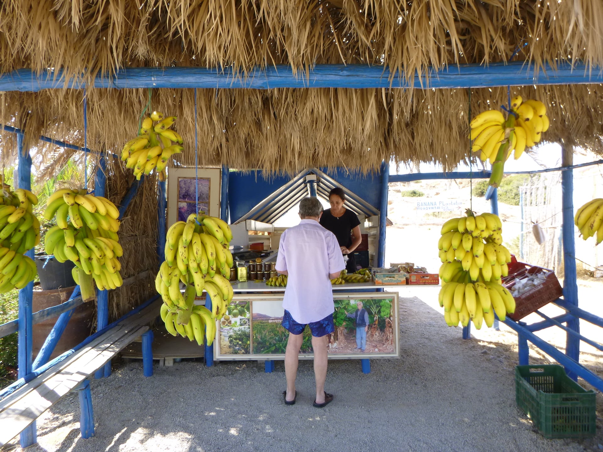 Podarilo sa a nemusel som sa ani štverať na plot, za ktorým bola plantáž ukrytá. Po návrate z pláže VAI, pri ceste a schovanej plantáži, bol stánok. Aj olivový olej som si kúpil, ale aj banány. Skoro sme ich v aute zjedli. Výborné. Lenže, aké je to celé individuálne. Čítal som blog, kde autor opisoval Krétske banány ako nechutné. A my sme, aby bolo čo porovnať, pred zjedením banány na poslednú chvíľu odfotili v dlaniach.