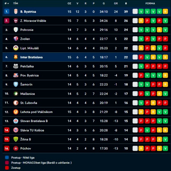 Banskobystričania v druhej futbalovej lige nepoznajú premožiteľa ani po 15. kole. V piatok večer potvrdili prvé miesto v tabuľke domácou výhrou nad Interom Bratislava 3:0. Piatkový večer na Štiavničkách mal slávnostný nádych. Duklisti nastúpili na 66. vzájomný zápas s Interom pri príležitosti 60. výročia vzniku futbalového klubu.