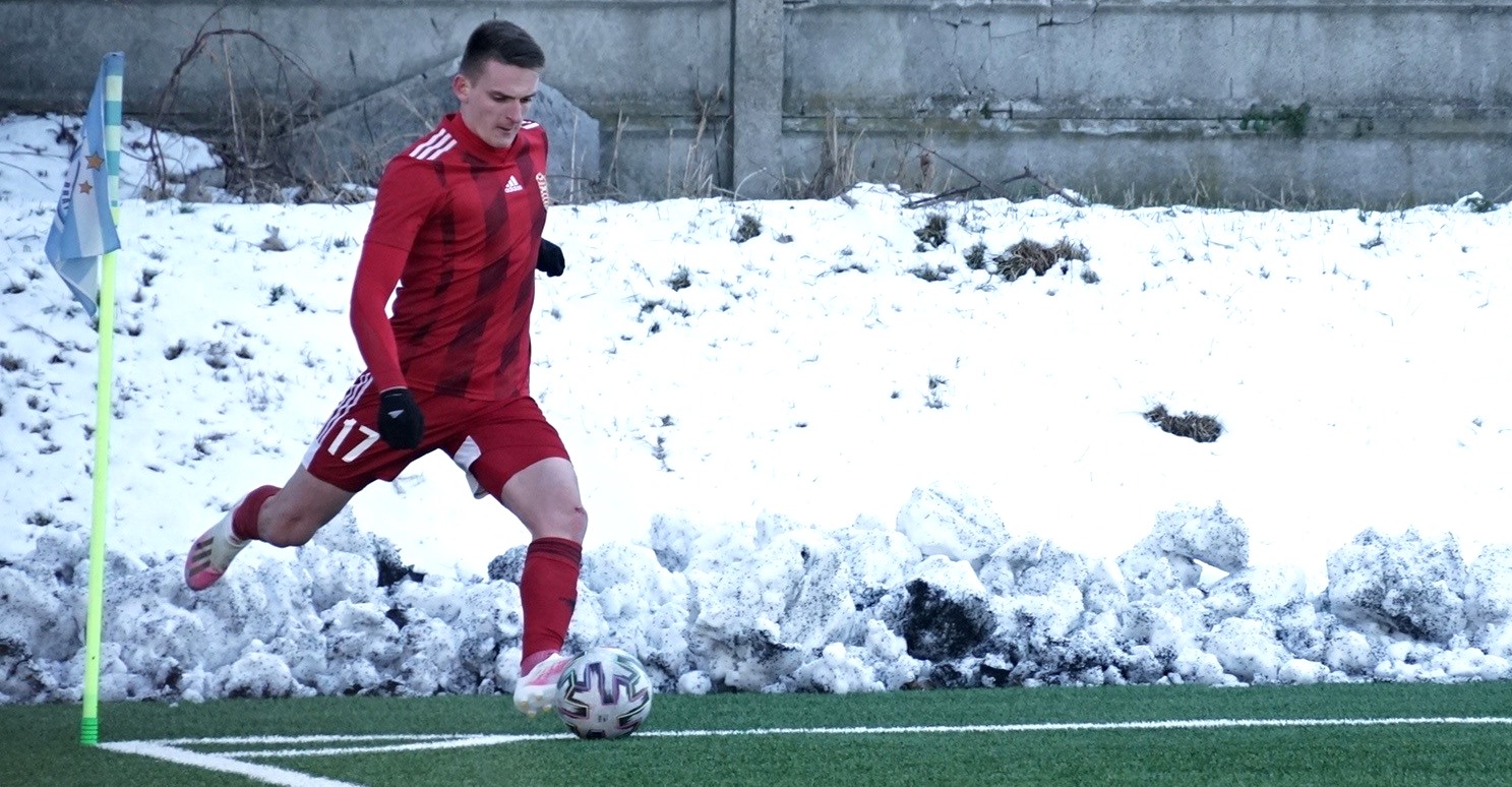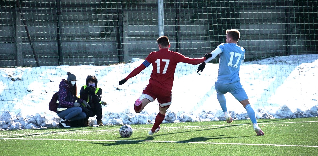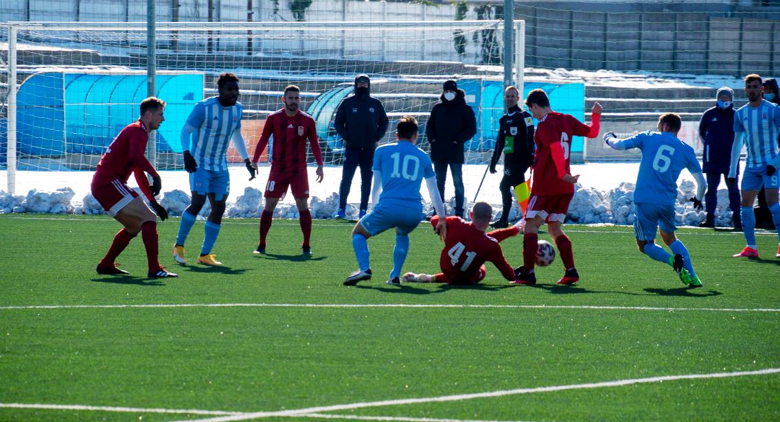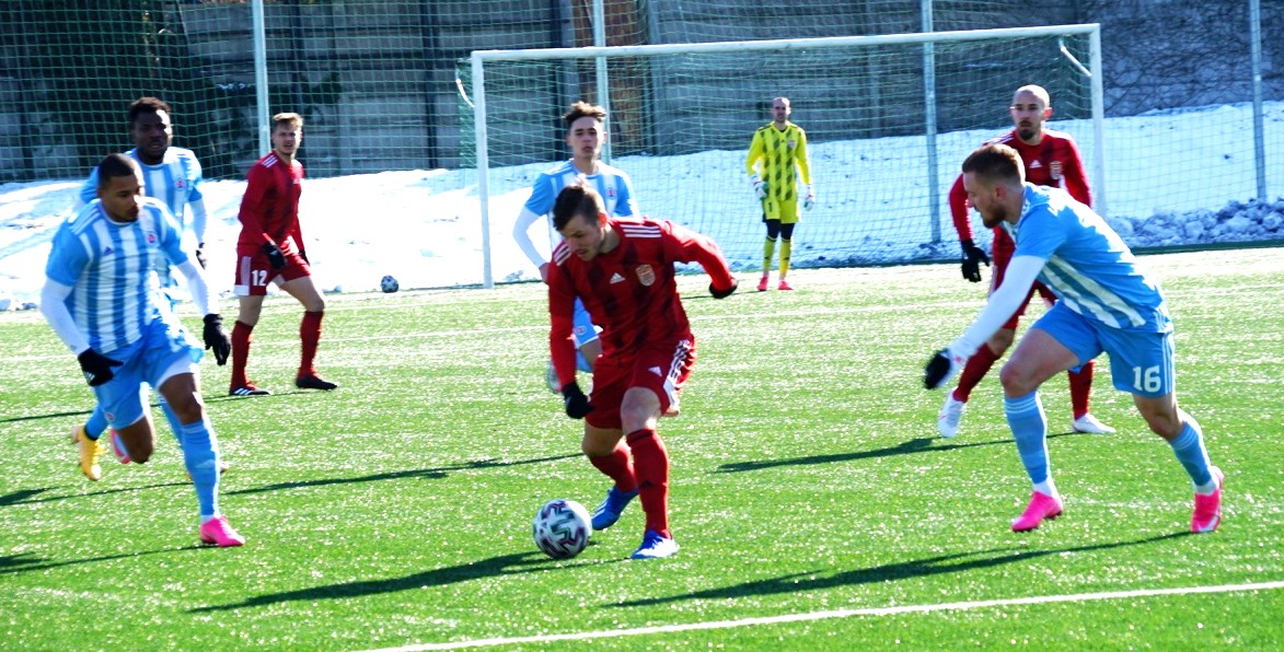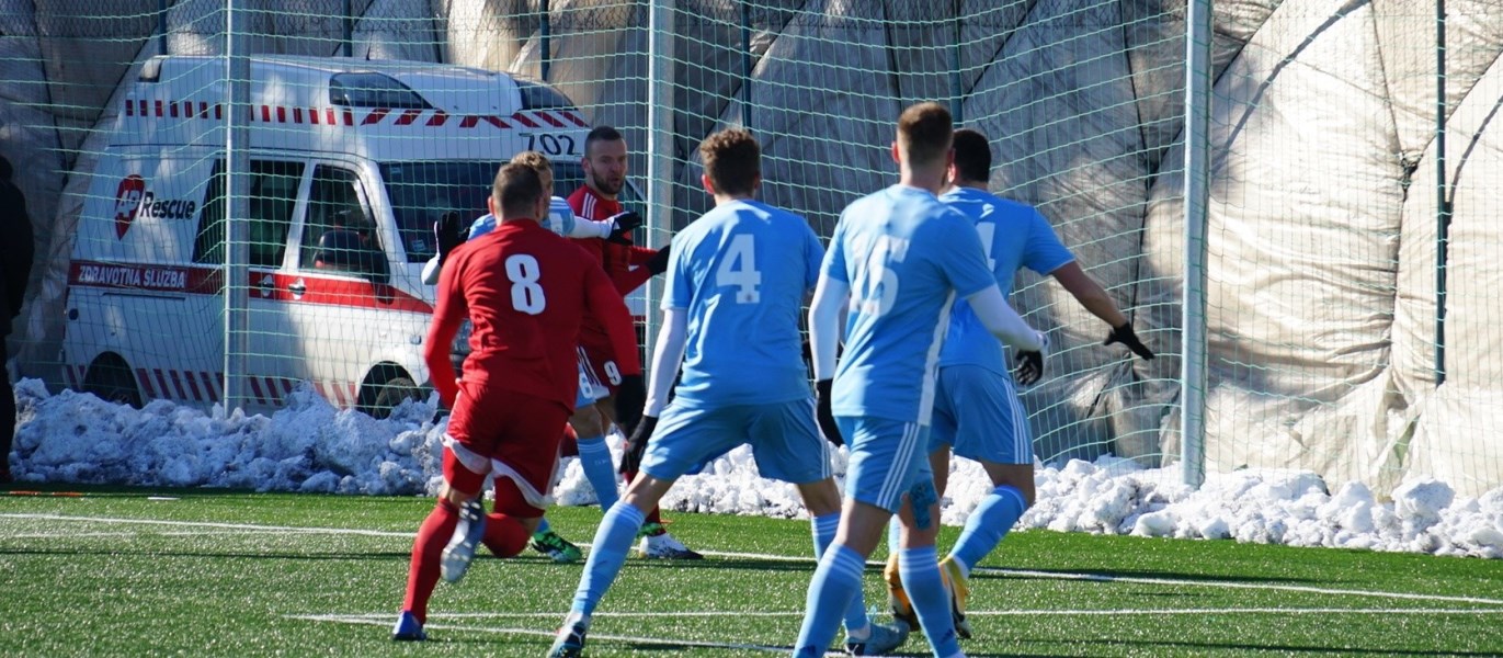 Umelý trávnik na bývalom štadióne Rapidu v Ružinove bol vo výbornom stave, ale hralo sa za mrazivého, hoc slnečného počasia pri teplote nula stupňov. Domáci išli rýchlo do vedenia, keď sa presadil z pravej strany v tretej minúte peknou strelou zblízka pod brvno k bližšej žrdi Medvědev 1:0. Následne sme mali príležitosti, najmä Polievka, ale chýbala presnejšia koncovka. Na úvodný zásah súpera sme odpovedali v trinástej minúte po rohu Polievku Matejom Starším hlavou, ale vyrovnávajúci stav 1:1 dlho netrval, pretože o päť minút na to Ratao peknou umiestnenou strelou z hranice šestnástky do vinkla menil stav na 2:1. Hruška bol bezmocný. Ubehli však iba dve minúty a my sme sa opäť tešili z vyrovnania. Po prihrávke Migaľu Lukáš Laksík predviedol v šestnástke parádne nožničky cez hlavu a bolo 2:2. Pokým sa bystrickí futbalisti prezentovali technickým futbalom, snažili sa o útočnú a kombinačnú hru, domáci im to znepríjemňovali tvrdou hrou na hranici pravidiel. Rozhodca Kišš veľa faulov prehliadal a neuznal nám gól pred polčasom, keď loptu z dorážky poslal medzi žrde znovu Laksík. Mal tomu totiž predchádzať diskutabilný faul Prikryla vo výskoku.