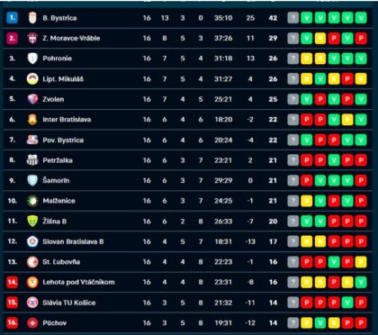 Banskobystričania v druhej futbalovej lige nepoznajú premožiteľa ani po 16. Kole. Zvládli nedeľný duel v Košiciach na otrasnom náročnom teréne domácej Slávie TU. Vyhrali tam najtesnejším rozdielom 1:0, a to aj napriek viac než 50-minútovej hre v oslabení po červenej karte pre Šikulu. O víťazný moment sa postaral Gerec.