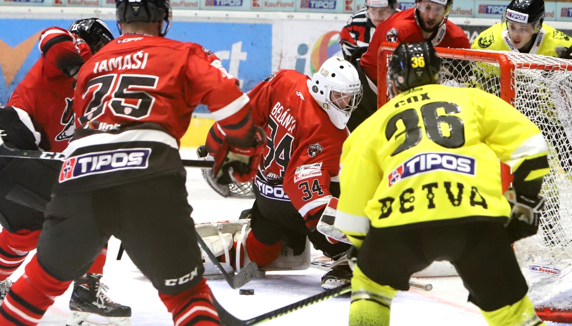 Góly: 19. Vybíral (Faško-Rudáš, Kabáč), 39. Tamáši (Mistele, Breton), 44. Tamáši (Faško-Rudáš, Mistele) – 30. Ľupták (V. Fekiač), 33. Čacho (Charbonneau), 53. Gachulinec (Lyle), 57. Gachulinec (Curry, Downing). Rozhodovali: M. Valach, Adamec – Valo, Frimmel, vylúčenia na dve min.: 4:7, presilovky: 0:1, oslabenia: 0:1, bez divákov
