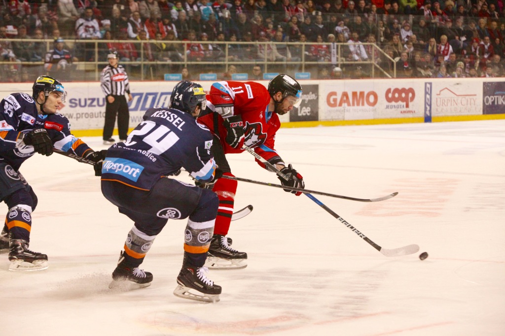 V úvode zápasu mohli ísť do vedenia ´barani´. Faille sa dobre natlačil pred bránku, ale zblízka do nej puk nepretlačil. Na opačnej strane zaujala v piatej minúte strela Kafku z pravej strany a následná dorážka Klímu, no miesto puku skončil v bránke hosťujúci zakončovateľ. Potom šancí ubudlo, prvá vážnejšia sa naskytla až v košickej presilovke. Šedivý strieľal od modrej a po možnom teči Pacana zvonila žŕdka. V 16. minúte unikal v oslabení náš Skalický, bol trošku tiesnený a Habala nepokoril. Skóre sa tak menilo na opačnej strane. Ladislav Nagy si ukážkovo obkorčuľoval bránku, poslal puk cez bránkovisko na opačnú žrď, kde číhal nepokrytý David Pacan – 0:1. Do prestávky mohol vyrovnať Asselin, zakončoval z medzikružia tesne vedľa. Posledné slovo mal v prvej tretine košický obranca Kessel, ktorý sa natlačil pred Lukáša, no neprekonal ho.
