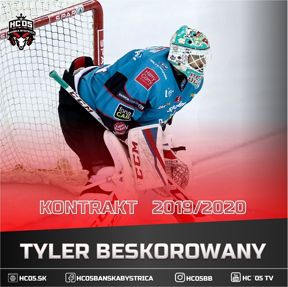 Vedeniu nášho klubu sa podarilo vyriešiť aj veľmi dôležitý brankársky post. Medzi žrde sa postaví kanadský gólman Tyler Beskorowany. Ten prichádza do Banskej Bystrice z britskej najvyššej súťaže Elite Ice Hockey League, v ktorej obliekal dres severoírskeho tímu Belfast Giants.