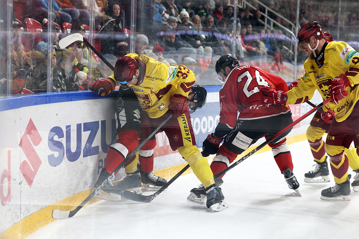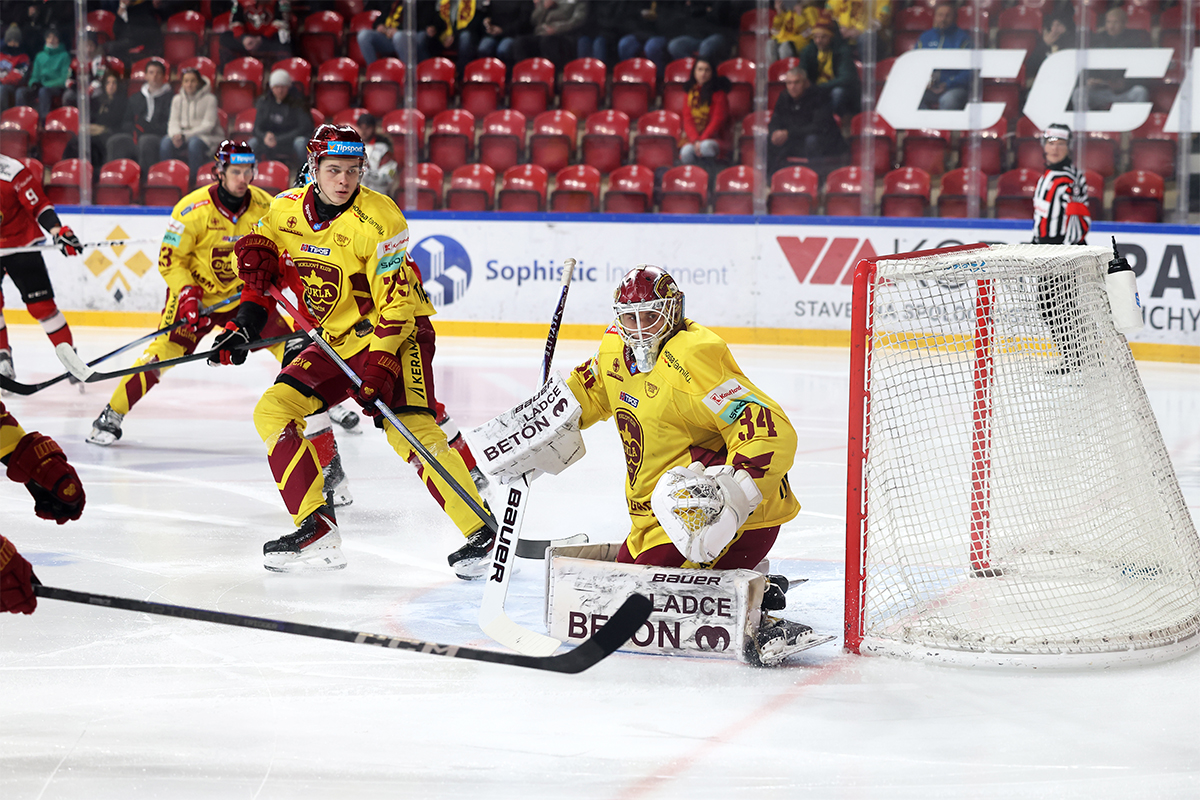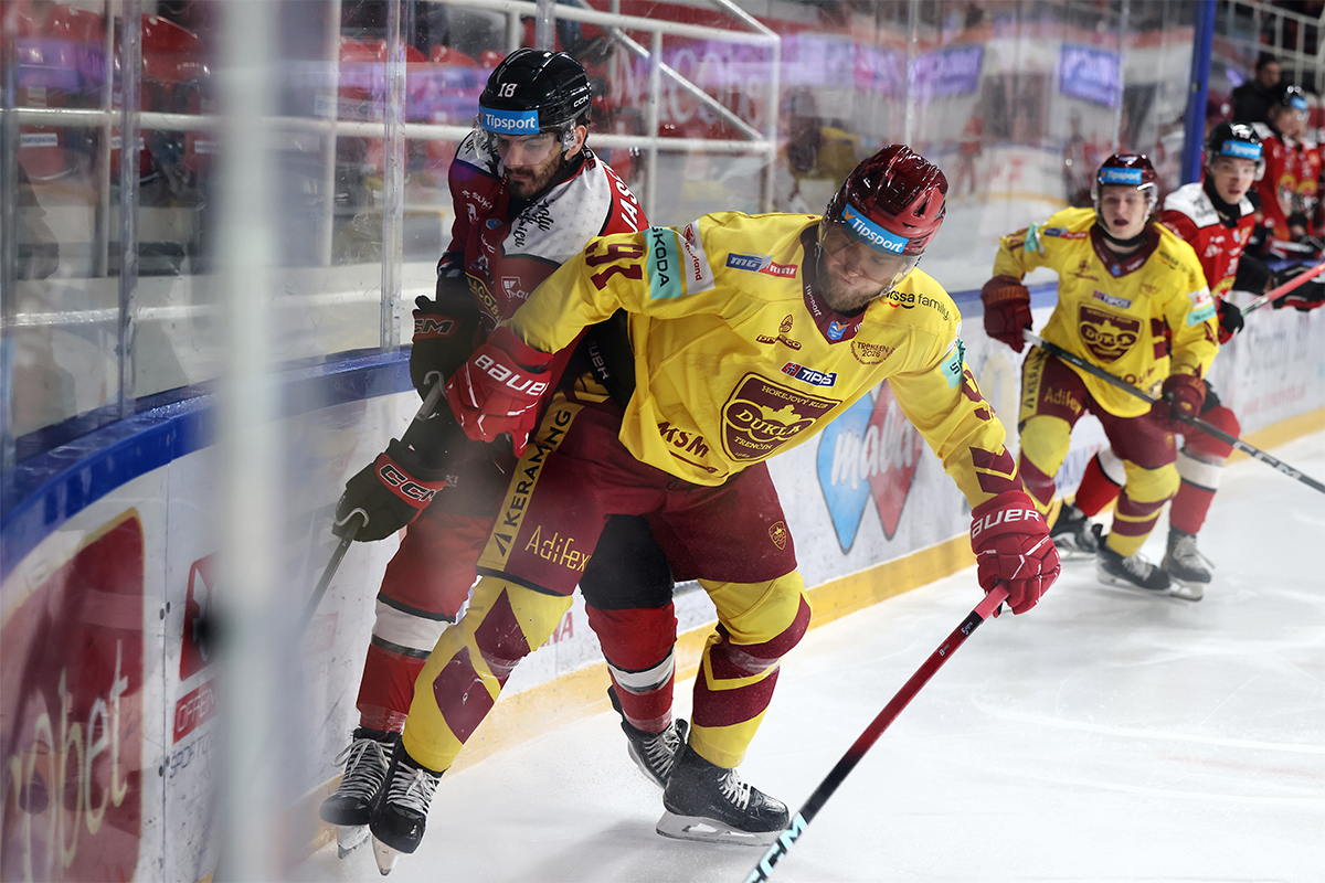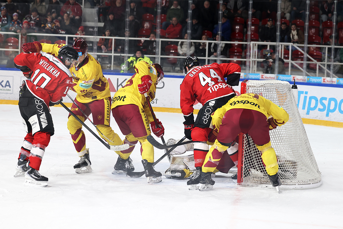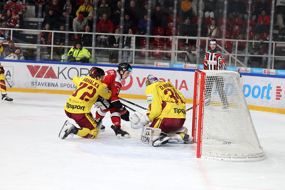 Zápas proti Trenčínu mal od úvodných minút vysoké tempo a emóciu. Už v druhej minúte sa na moment zdalo, že sa ´barani´ dostanú do vedenia, ibaže po preskúmaní videozáznamu gól Ziga pre pohyb nohou neplatil. Hostia následne pohrozili v prečíslení, no Rabčan podržal mužstvo. Prvá tretina sa postupne vyvinula v prospech Dukly, ktorá využila presilovú hru Bezúchom po strele z väčšej vzdialenosti – 0:1 a krátko na to pridala aj druhý zásah Varoneom, ktorý sa presadil zblízka pri pravej žŕdke – 0:2. Dôležitý moment však prišiel ešte pred prestávkou, keď Oleksij Myklucha po peknej kombinácii s Turnbullom znížil 48 sekúnd pred prestávkou na 1:2 z ľavej strany a vrátil svoj tím späť do zápasu.