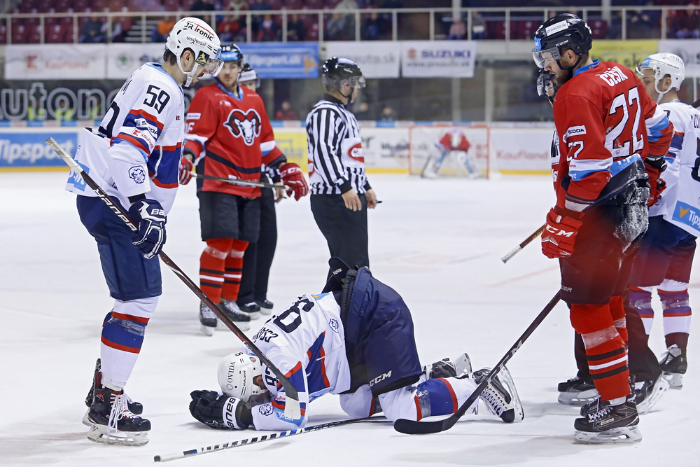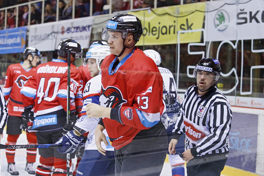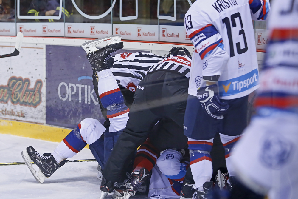 Góly: 3. Brittain (Asselin, Gründling), 18. Lamper (M. Lunter, T. Surový), 39. Faille (Asselin, Brittain). Rozhodcovia: Kalina, Müllner – Jobbágy, Bogdaň. Vylúčení na 2.min: 3:7. Vyššie tresty: Belluš – Versteeg 10 min. osobné tresty za zhodenie rukavíc. Presilovky: 0:0. Oslabenia: 0:0. Diváci: 2511.