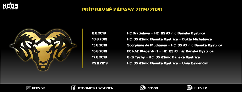 Prvé stretnutie odohrá náš klub v hlavnom meste Slovenska. Sily si zmeria s druholigistom HC Bratislava vo štvrtok ôsmeho augusta. O dva dni neskôr, v sobotu 10. augusta vyzveme na domácom ľade zverencov bystrického trénera Miroslava Chudého – nováčika z Michaloviec. Úvodné buly je naplánované na 17.30 hod. Na oficiálnom facebooku HC ´05 sa píše: