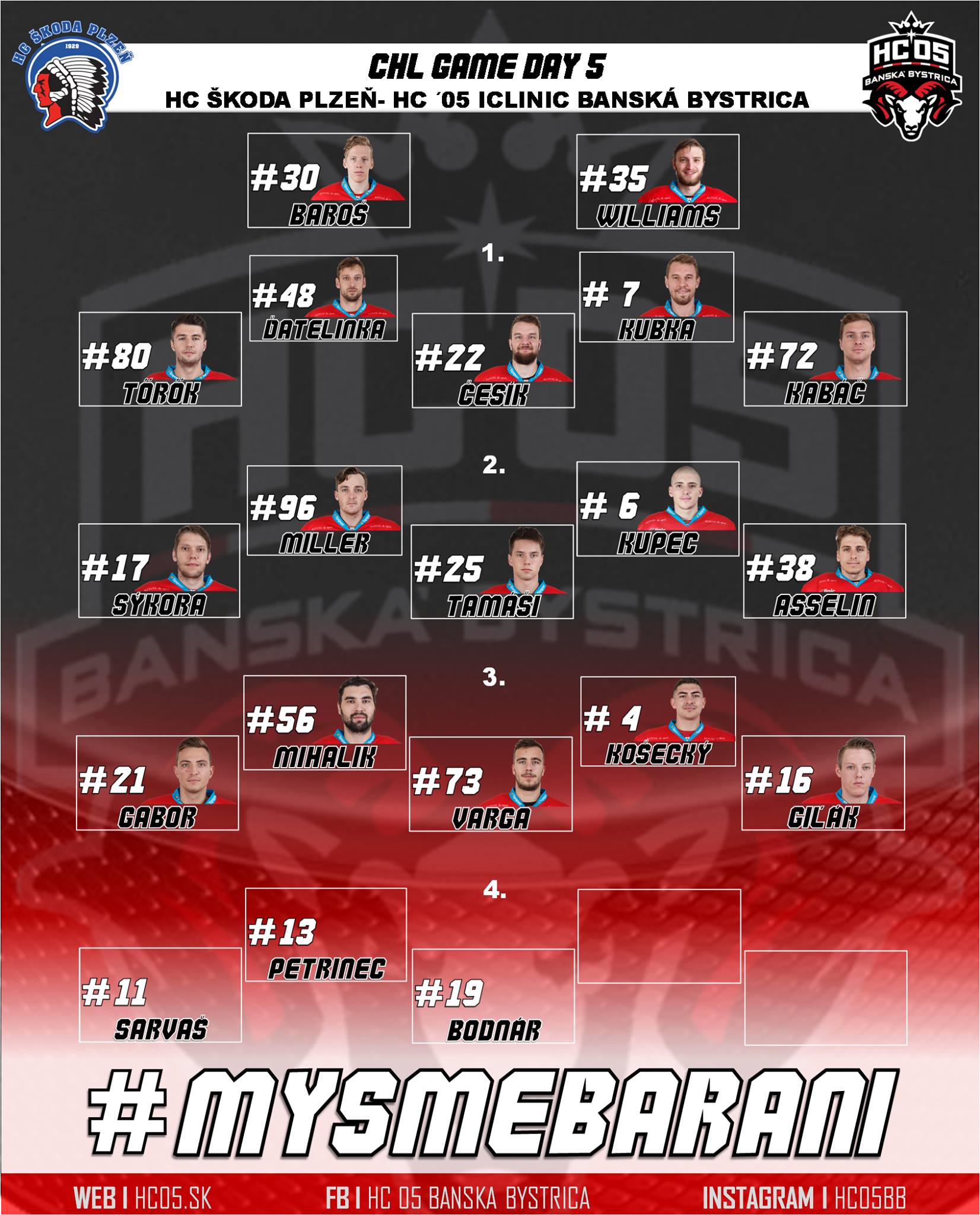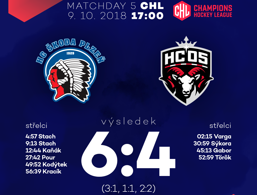 Barani sa predstavili v piatom zápase Ligy majstrov (CHL) v H-skupine na ľade vedúcej Plzne v oklieštenej zostave. Nenastúpili viaceré opory nášho kádra, konkrétne zranení obrancovia Biro a Sloboda, ďalej zranení útočníci Šťastný, Faille a Zigo, chorý Buc, potrestaný zadák Marshall a voľno dostali Surový s Higgsom. Aj súper šetril viacerých hráčov, ale napriek tomu podľa očakávania vyhral.