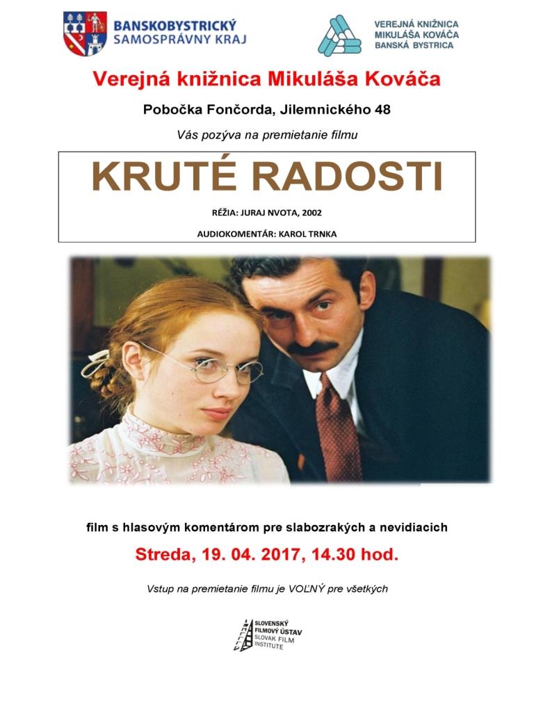Pobočka Verejnej knižnice Mikuláša Kováča na Jilemnického 48 (Fončorda) pozýva všetkých záujemcov v stredu 19. apríla 2017 o 14:30 hod. na premietanie filmu režiséra Juraja Nvotu Kruté radosti s audiokomentárom Karola Trnku. Vstup je voľný.