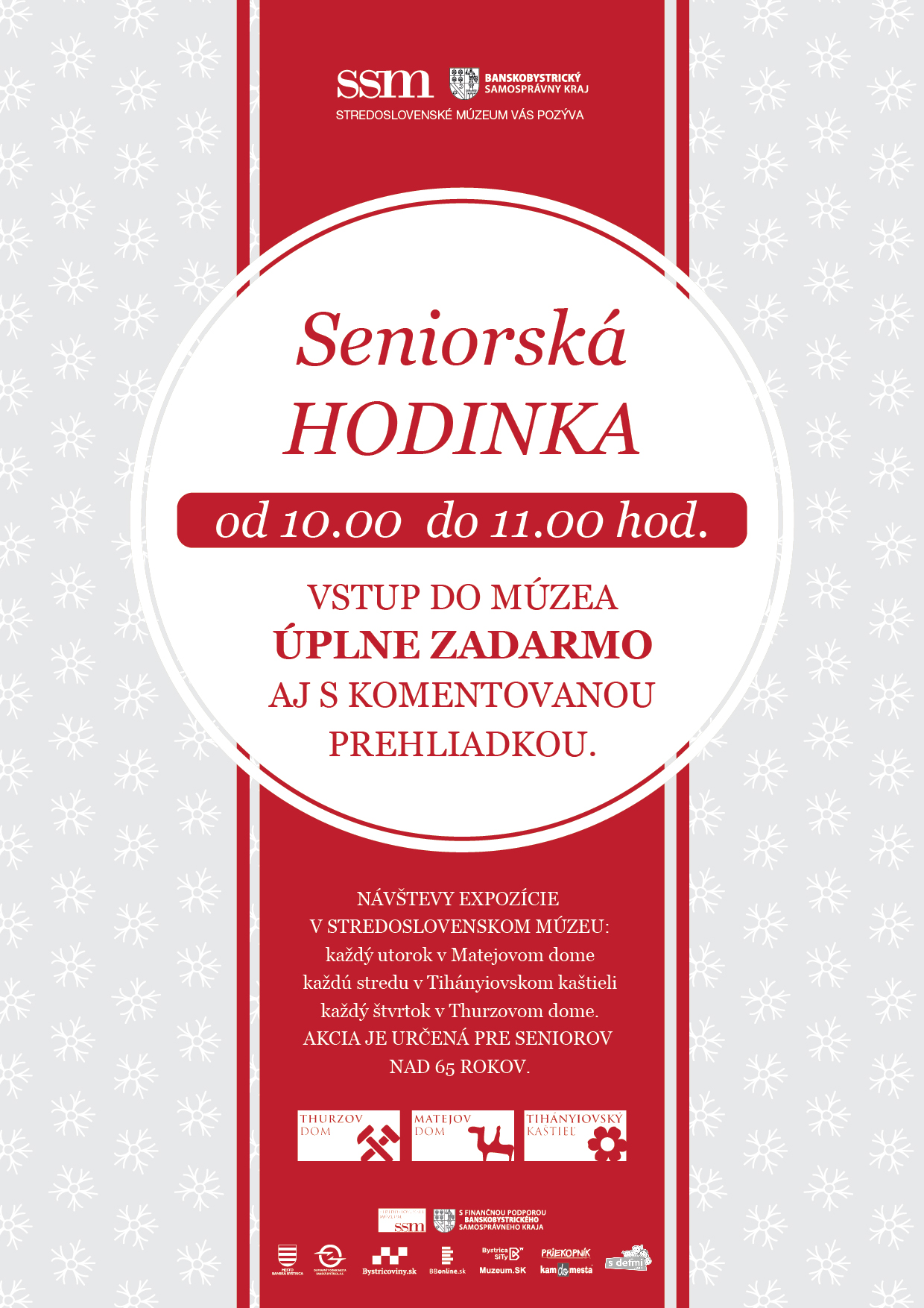Seniori nad 65 rokov, ktorým celoročne patrí naša vďaka a úcta, sa počas decembra dostanú do expozícií Stredoslovenského múzea zdarma. Vstup, aj s komentovanou prehliadkou, im bude umožnený vo vyhradenom čase, a to od 10:00 do 11:00 hodiny v rámci akcie „Seniorská hodinka“.