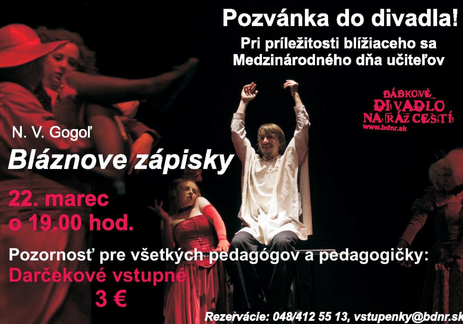 Rezervácia vstupeniek: 048/412 55 13, vstupenky@bdnr.sk.Pozvanka ucitelia Blaznove zapisky