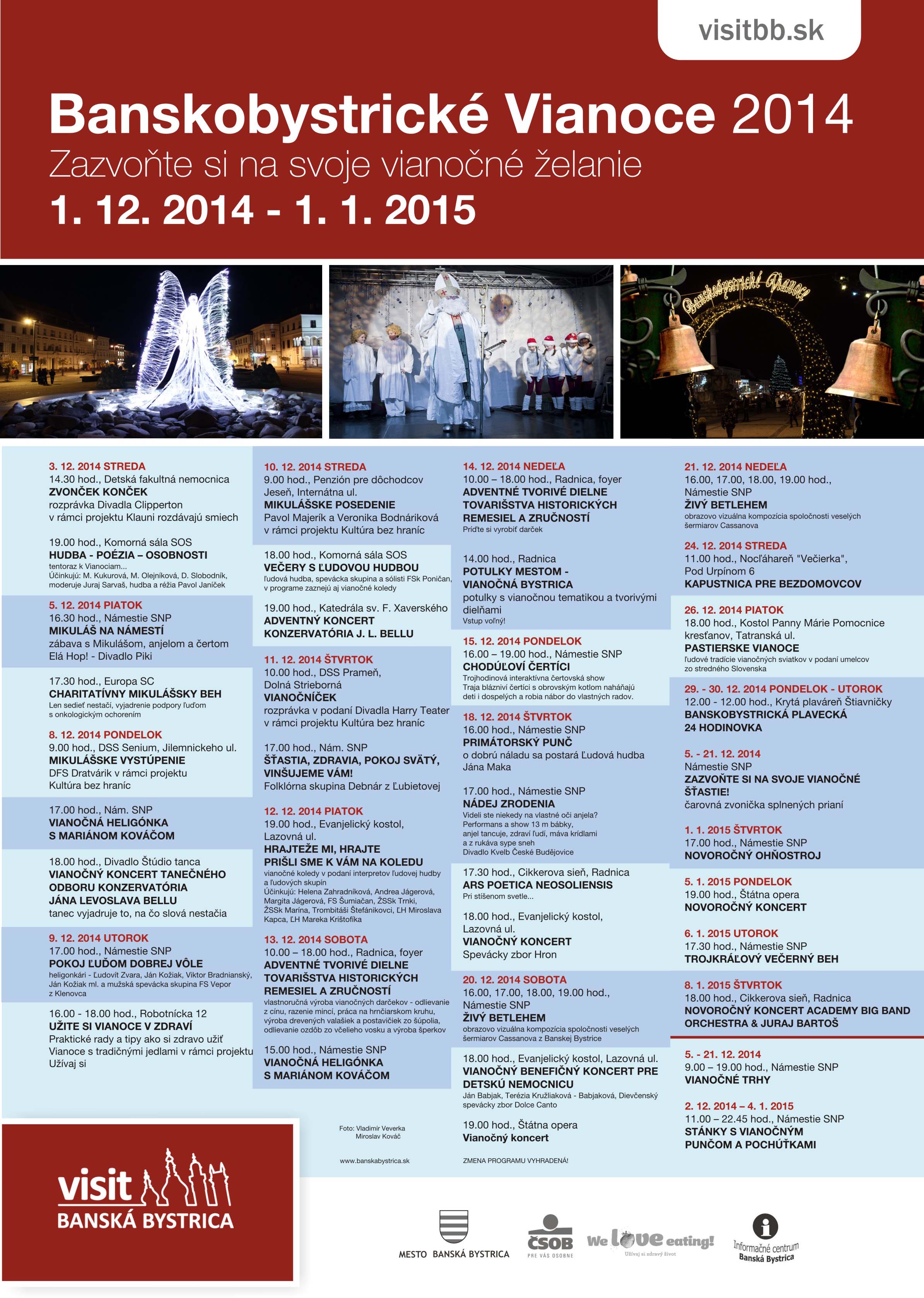 Vianočné trhy, program naplnený tradičnou ľudovou hudbou a vianočnými koledami, vítanie Mikuláša, zvonička želaní na Námestí SNP či podujatie Primátorský punč. Mesto Banská Bystrica opäť spestrí svojim obyvateľom najkrajší čas v roku – advent.