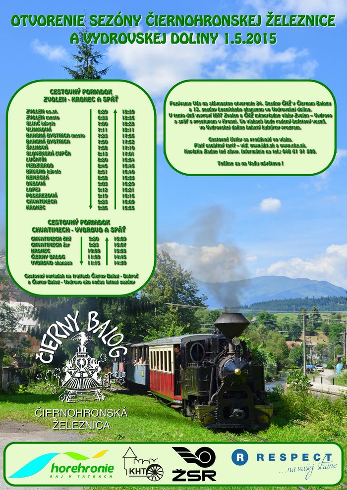 Z Hronca späť až do Zvolena odchádza vlak o 15:55 hod s príchodom na zvolenskú stanicu o 18.39 hod. Vo vlaku bude zaradený aj bufetový vozeň. Cestovné lístky si cestujúci kúpia vo vozňoch. Organizátormi prvomájového otvorenia letnej sezóny vo Vydrovej doline s cestovaním vlakom sú Čiernohronská železnica a Lesy SR.