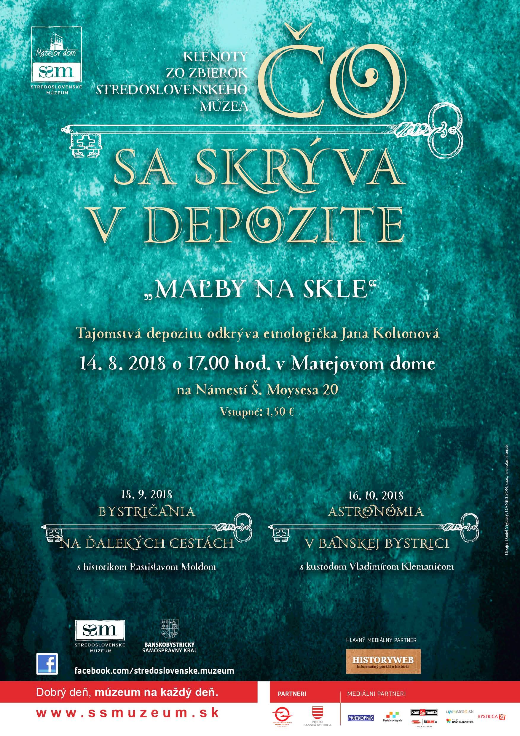 Počas augusta pripravilo Stredoslovenské múzeum pre svojich návštevníkov v rámci pravidelných prednášok najmä etnografické témy. Už najbližší utorok 14. augusta 2018 o 17:00 hodine v Matejovom dome predstaví etnologička Stredoslovenského múzea Jana Koltonová v rámci cyklu ČO SA SKRÝVA V DEPOZITE vzácnu kolekciu malieb na skle z okolia Banskej Bystrice.