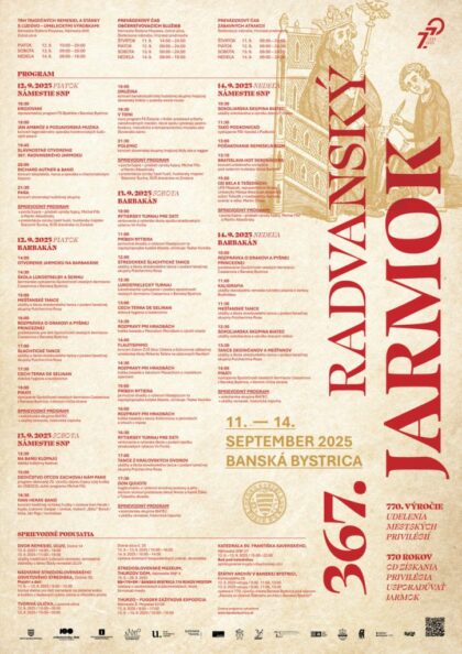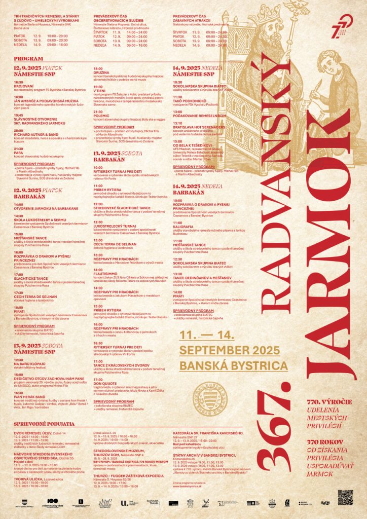 Už budúci týždeň bude Banská Bystrica žiť obľúbeným 367. Radvanským jarmokom v jubilejnom duchu. Tento ročník je výnimočný, pretože si pripomíname 770. výročie udelenia mestských práv. Jarmok prinesie do banskobystrických ulíc bohatý hudobný a kultúrny program, 251 domácich i zahraničných remeselníkov, rozpravy o histórii mesta a o 370. výročí získania privilégia usporadúvať jarmok, ale aj výstavy, divadlá a tvorivé dielne pre najmenších.