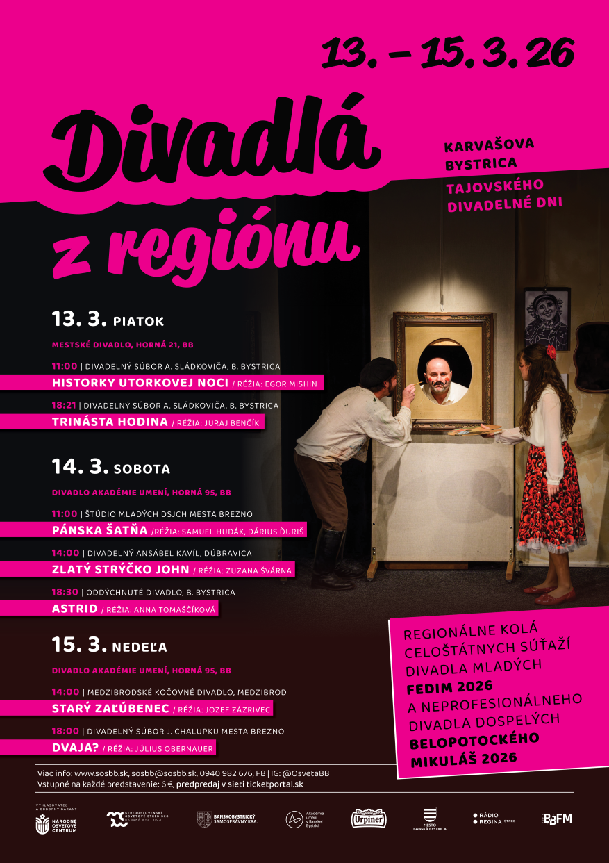 Stredoslovenské osvetové stredisko Vás pozýva na prehliadku amatérskych divadelných súborov z regiónu Banská Bystrica a Brezno DIVADLÁ Z REGIÓNU, ktorá je spojením súťaží Karvašova Bystrica a Tajovského divadelné dni – regionálnych postupových kôl celoslovenských prehliadok divadla mladých FEDIM 2026 a neprofesionálneho divadla dospelých BELOPOTOCKÉHO MIKULÁŠ 2026.