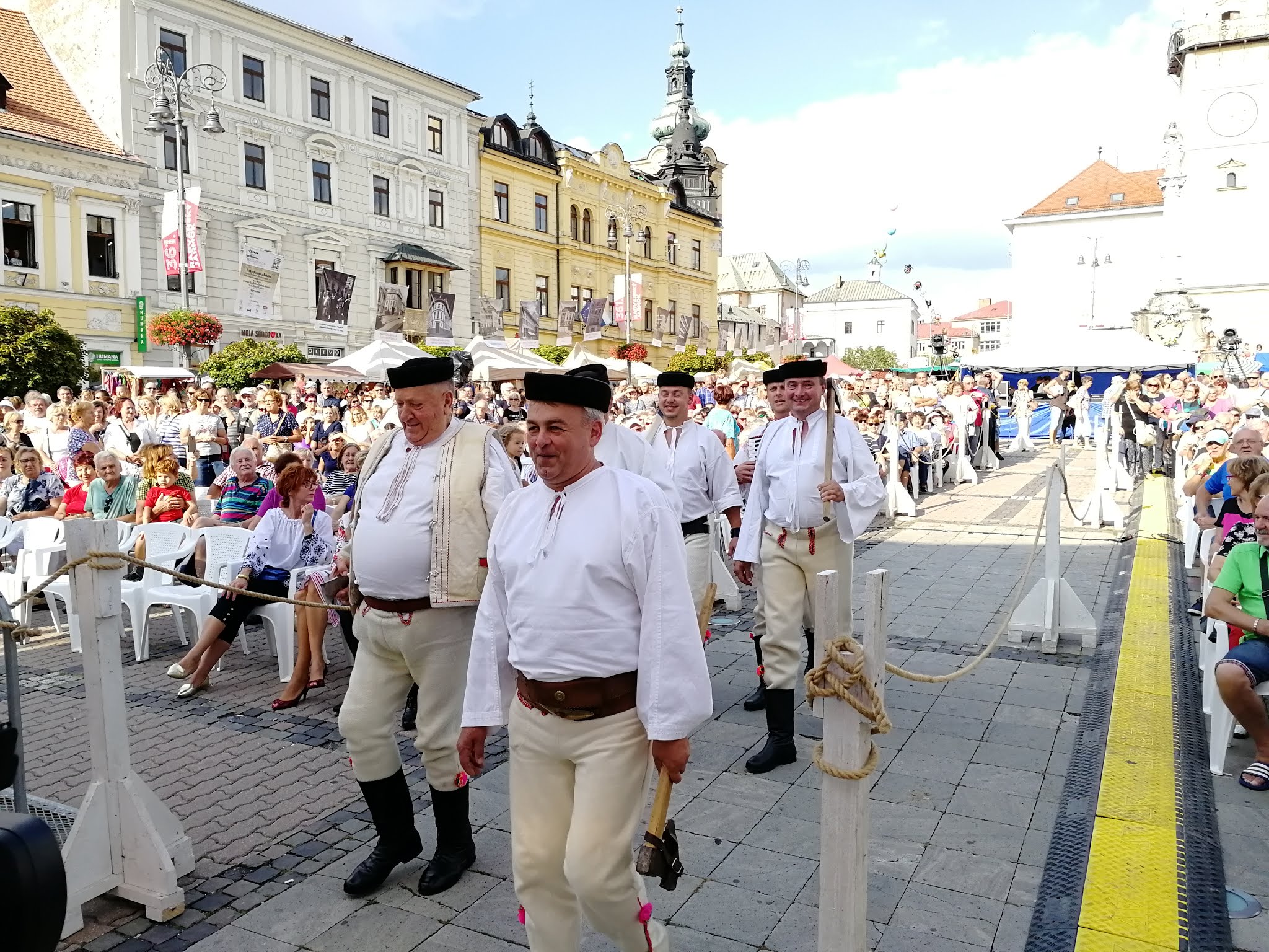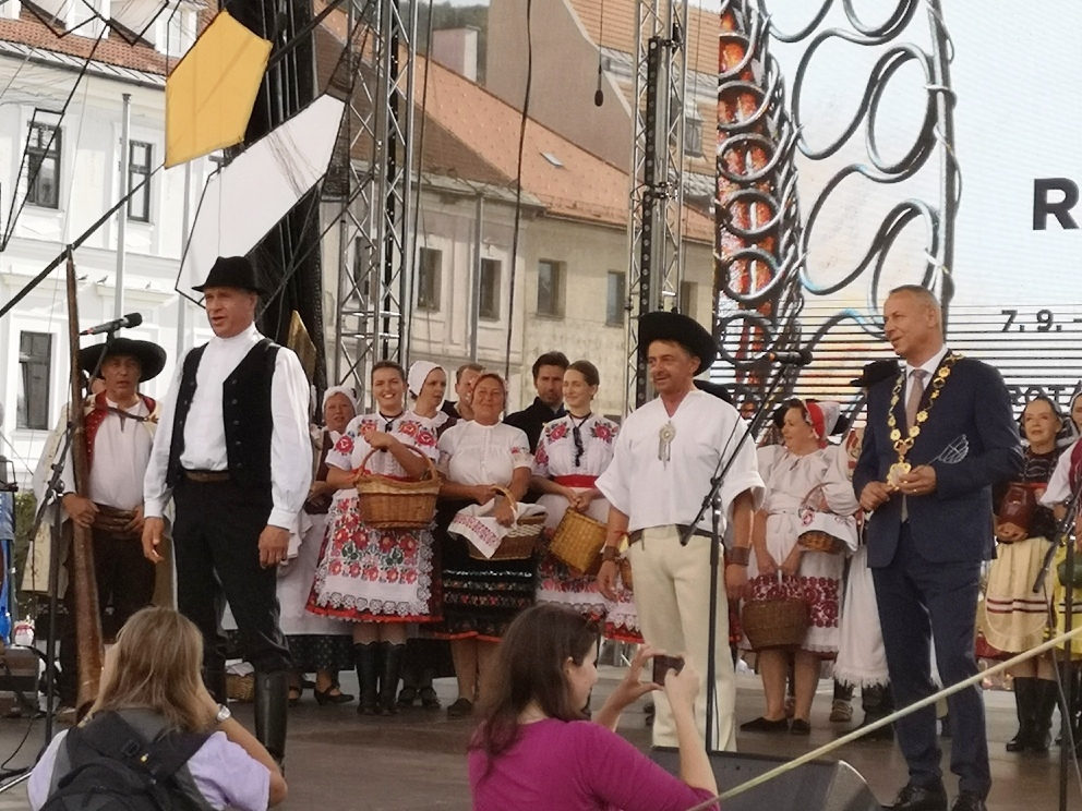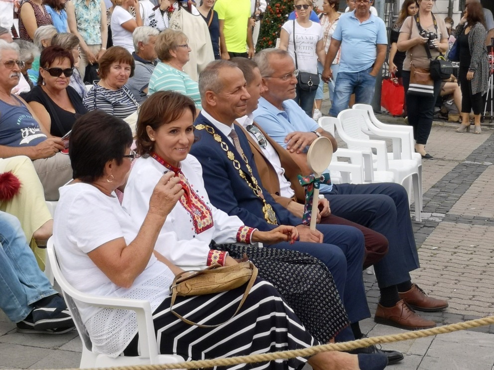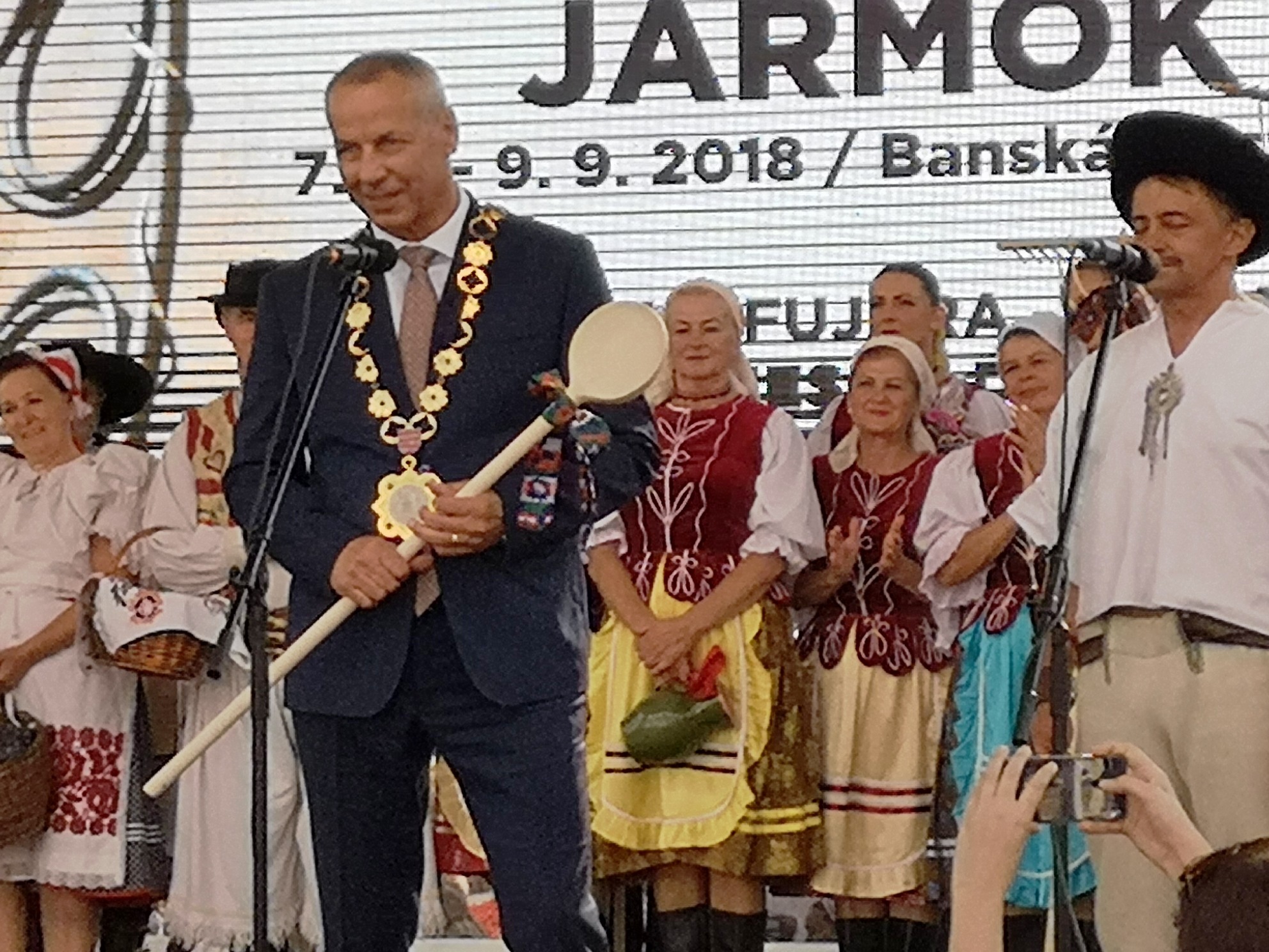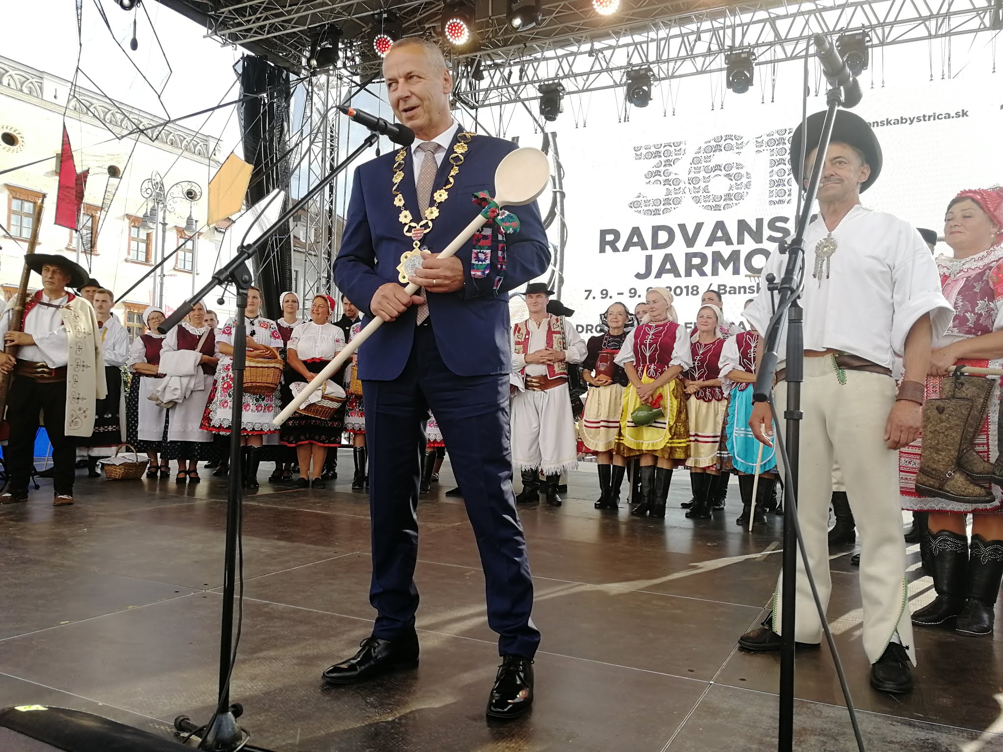 Potom vystúpil na pódium banskobystrický primátor Ján Nosko s veľkou drevenou vareškou a prihovoril sa prítomným remeselníkom a trhovníkom slovami: