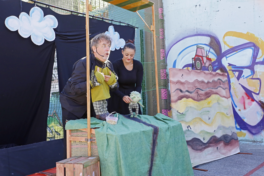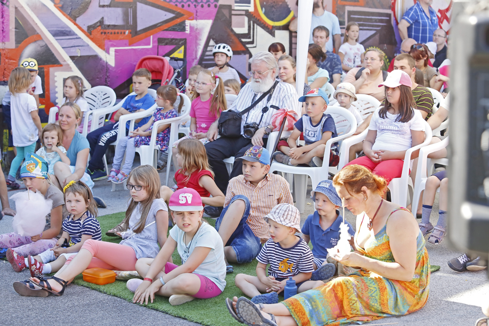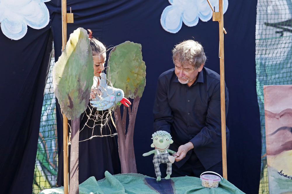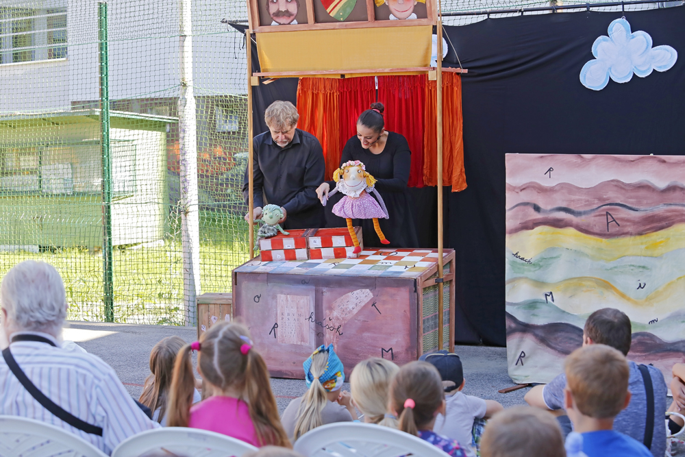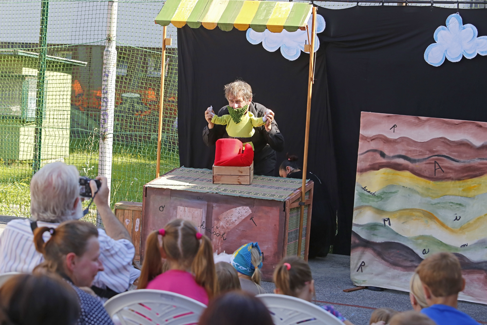 Malí i veľkí diváci si posadli na stoličky v športovom areáli pod oporným múrom na Rudohorskej pred malú scénu susedného Divadla pod balkónom – Harry Teatro. A mohla začať klasická rozprávka Pavla Dobšinského Janko Hraško v novej úprave.
