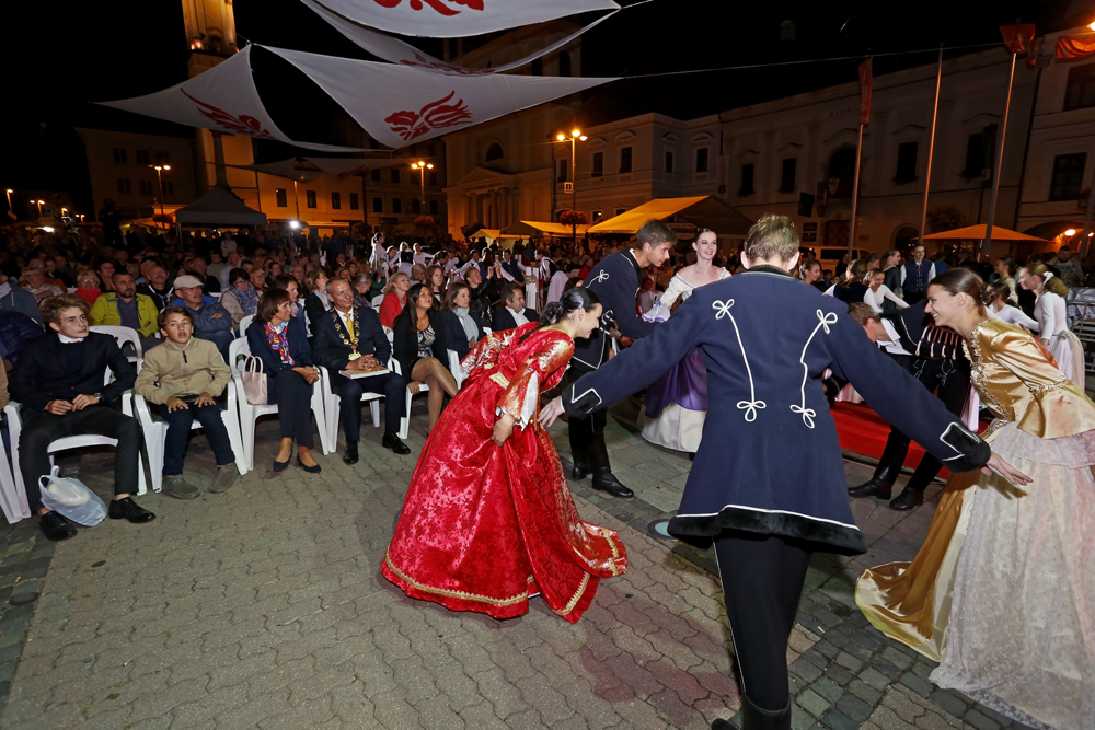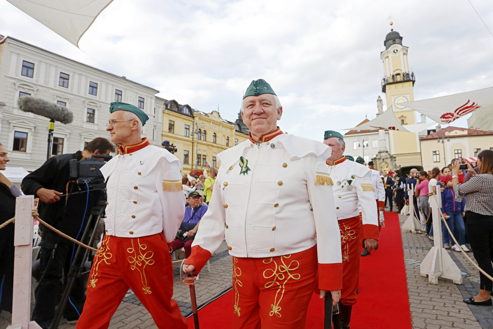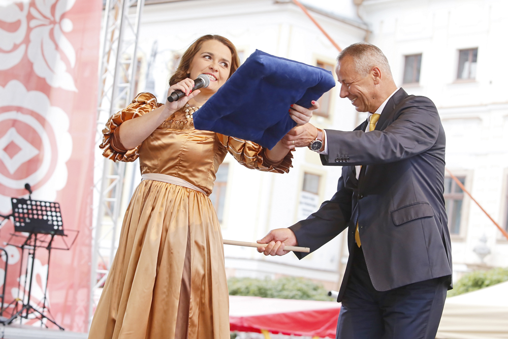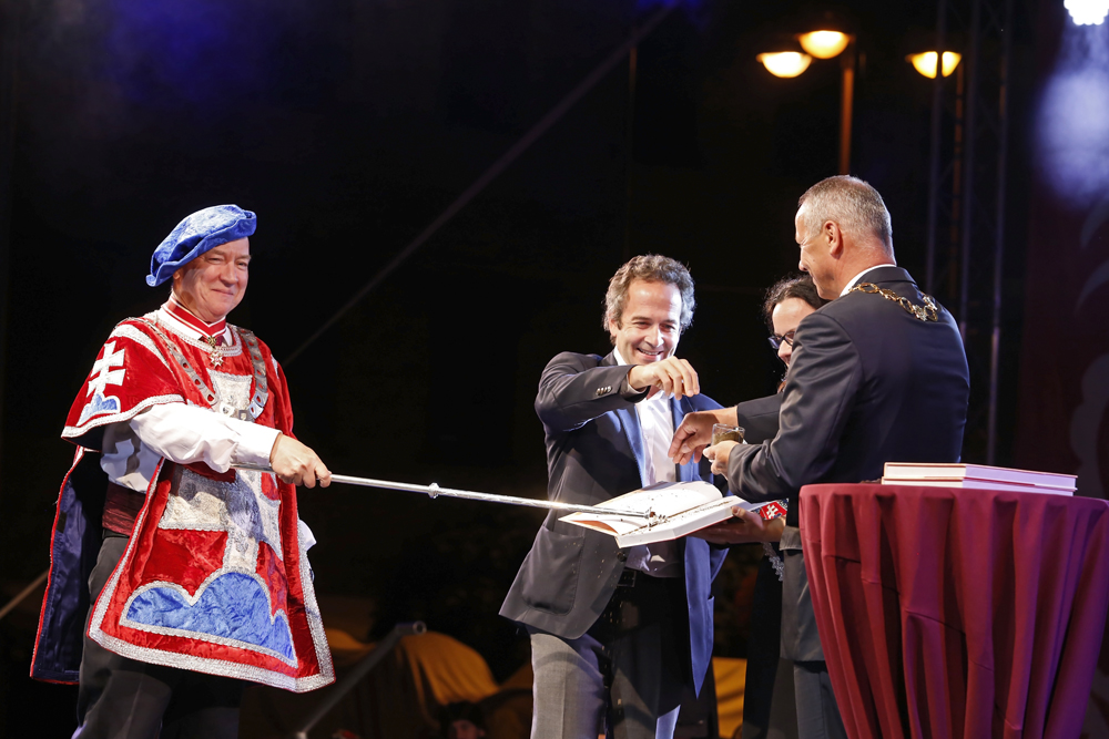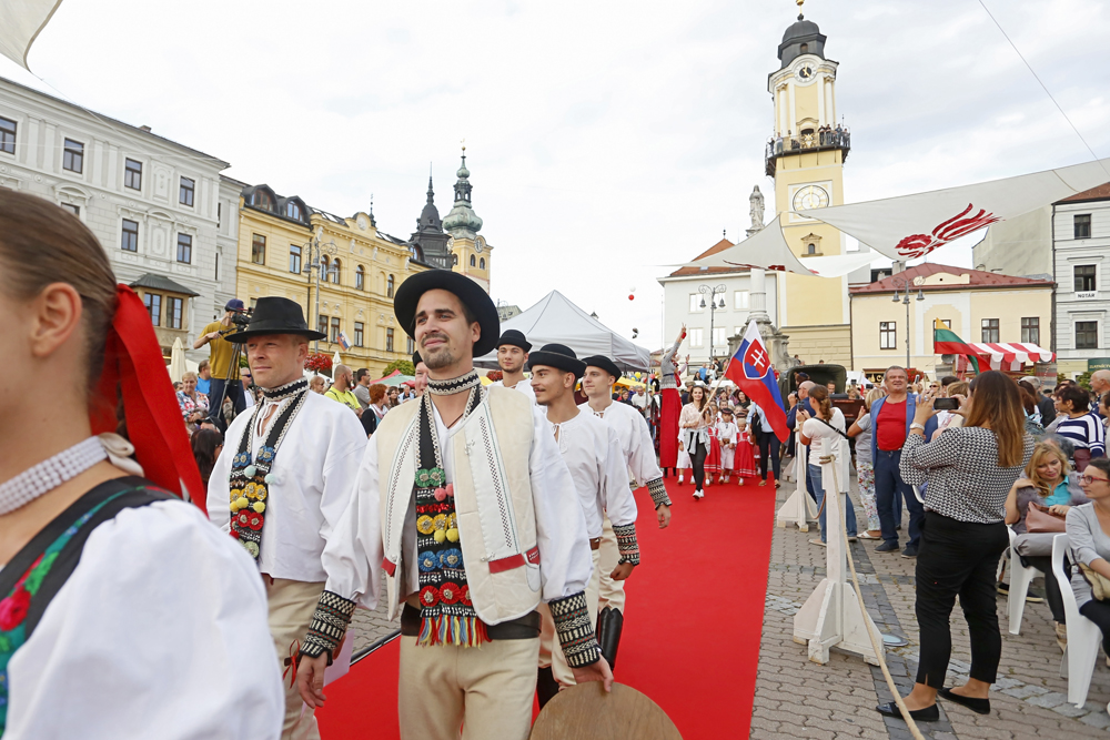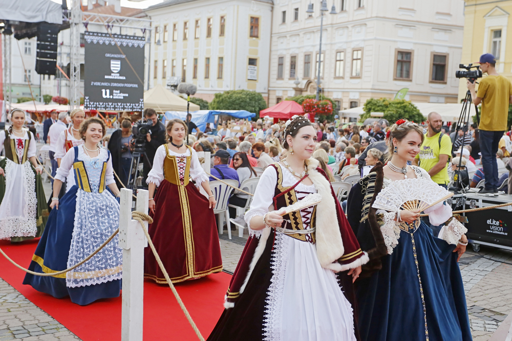 Na pódium pred zaplneným Námestím SNP priviedli primátora s barónom muži a ženy v historických kostýmoch, ľudoví umelci, herci, hudobníci, tanečníci a remeselníci v slávnostnom sprievode.