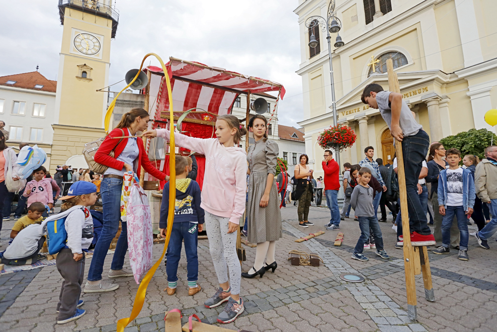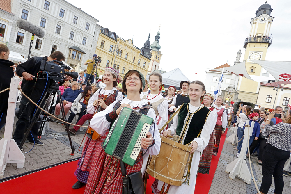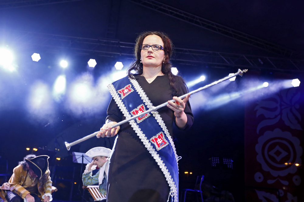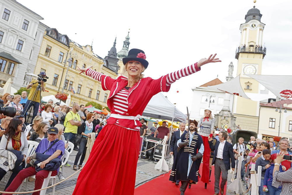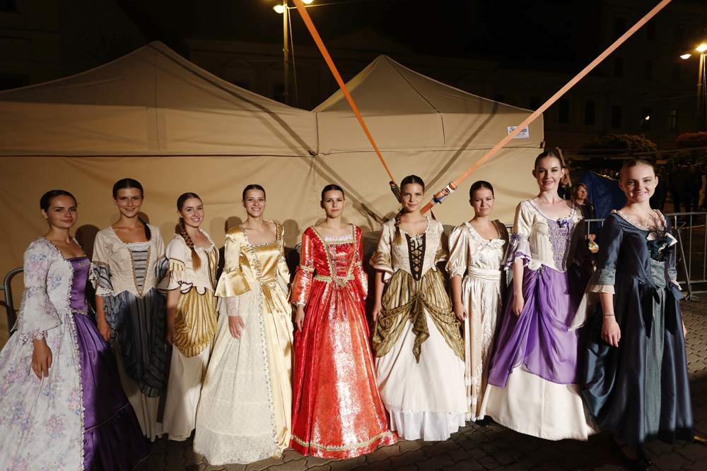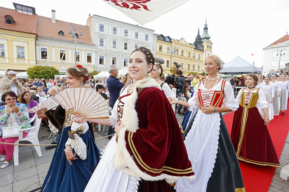 Na pódium pred zaplneným Námestím SNP priviedli primátora s barónom muži a ženy v historických kostýmoch, ľudoví umelci, herci, hudobníci, tanečníci a remeselníci v slávnostnom sprievode.