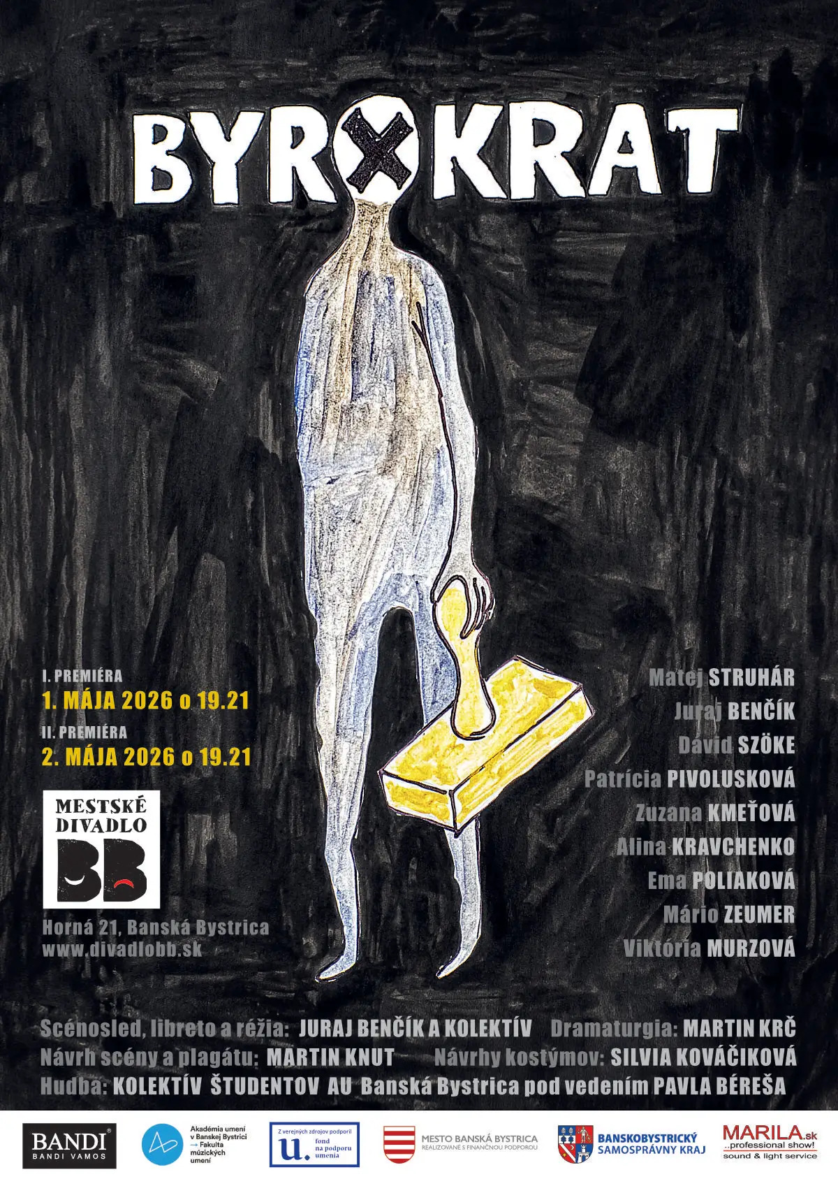 Spolu so živou hudbou a autorským hudobným sprievodom pedagóga a študentov Akadémie umení v Banskej Bystrici ide o jedinečné a v slovenských pomeroch výnimočné, pôvodné, kolektívne umelecké dielo Byrokrat.