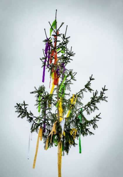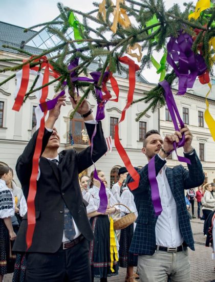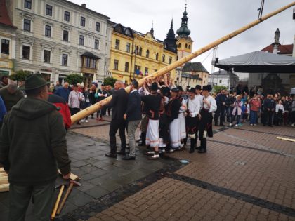 V utorok 30. apríla podvečer sa napriek dažďovým prehánkam zišli na Námestí SNP  folkloristi s pracovníkmi Mestských lesov, aby postavili pripravený máj zo statného smreka. Na pódiu najskôr vystúpil Detský folklórny súbor Prvosienka.