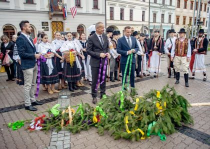 Potom naň Marian Čupka pozval primátora mesta Jána Noska. Ten priniesol symbolickú fľašu slivovice s peniazmi pre stavačov mája, ktorý ležal pod pódiom. Najskôr ho v spolupráci s prvým viceprimátorom Jakubom Gajdošíkom a poslancom Michalom Škantárom ozdobili farebnými stužkami.. Potom ho s tanečníkmi FS Urpín vedenými Petrom Pohančaníkom pomáhali lesníkom s mechanizmom postaviť a upevniť do pripraveného otvoru v dlažbe námestia. Prišla aj poslankyňa Katarína Čižmárová.