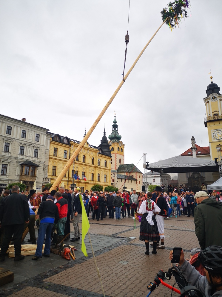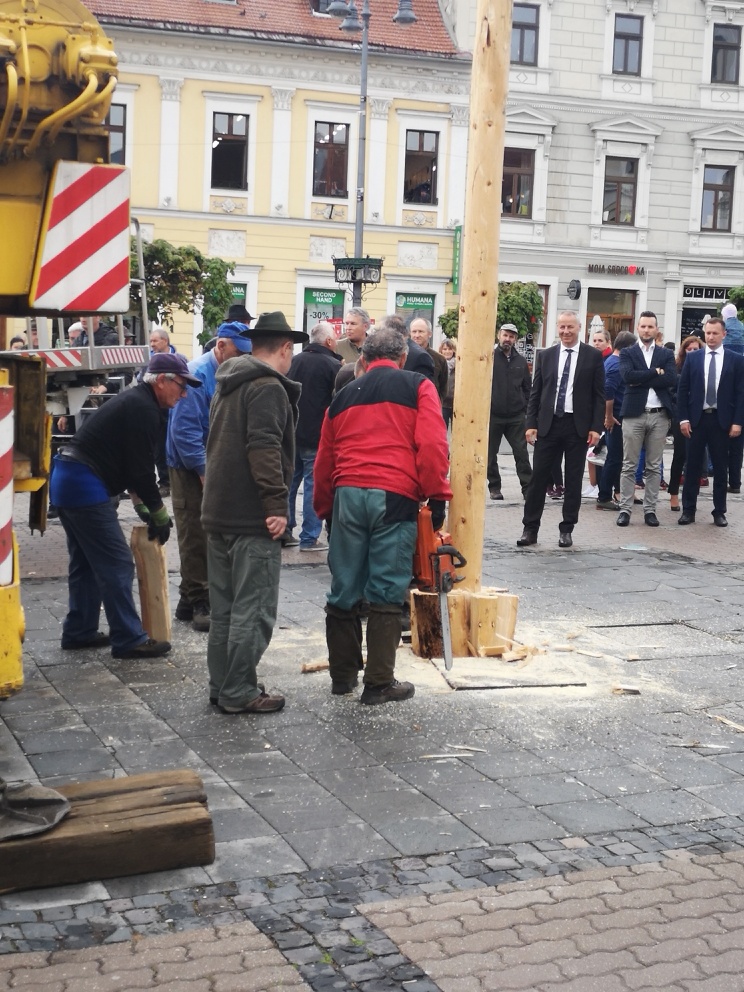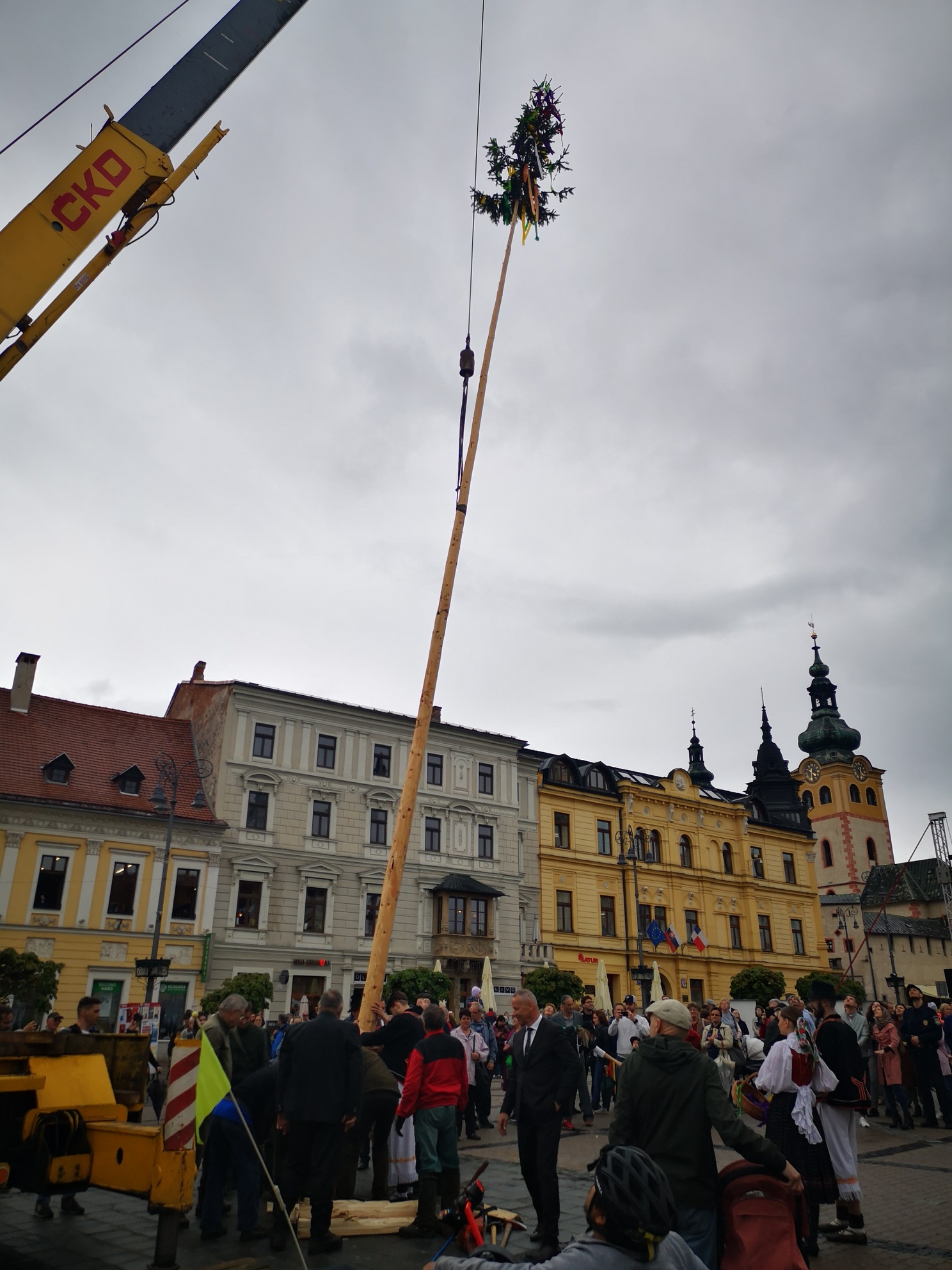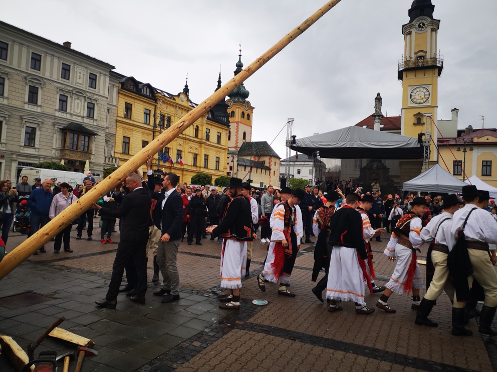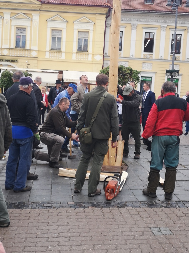 Potom naň Marian Čupka pozval primátora mesta Jána Noska. Ten priniesol symbolickú fľašu slivovice s peniazmi pre stavačov mája, ktorý ležal pod pódiom. Najskôr ho v spolupráci s prvým viceprimátorom Jakubom Gajdošíkom a poslancom Michalom Škantárom ozdobili farebnými stužkami.. Potom ho s tanečníkmi FS Urpín vedenými Petrom Pohančaníkom pomáhali lesníkom s mechanizmom postaviť a upevniť do pripraveného otvoru v dlažbe námestia. Prišla aj poslankyňa Katarína Čižmárová.