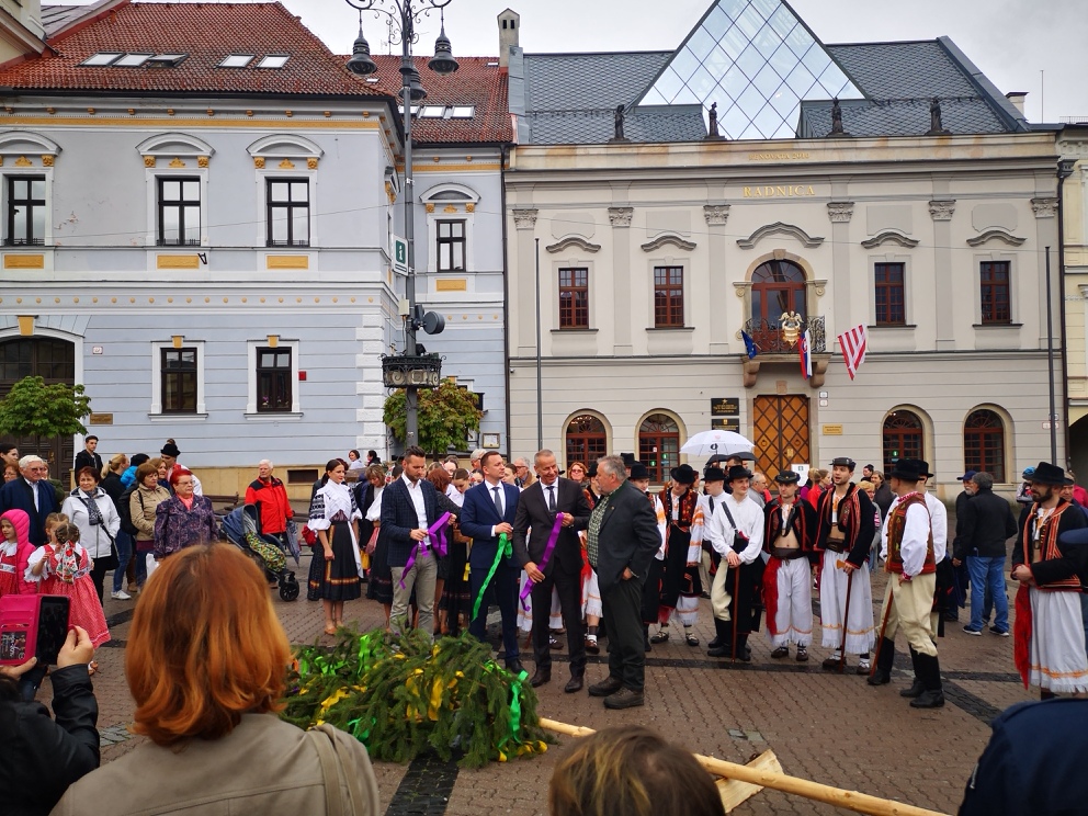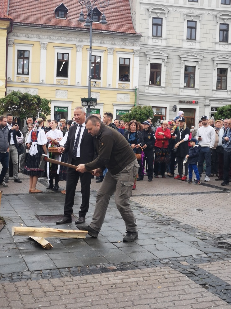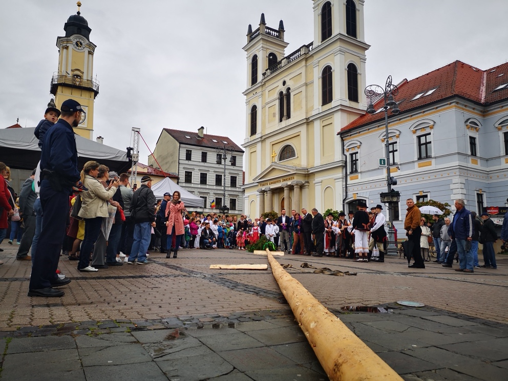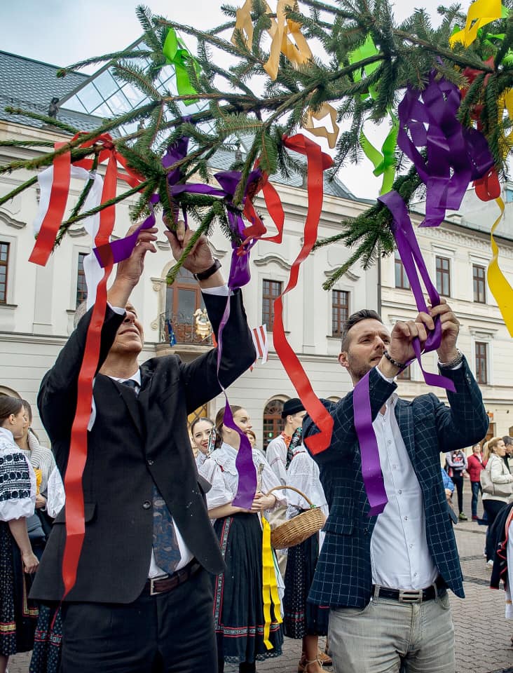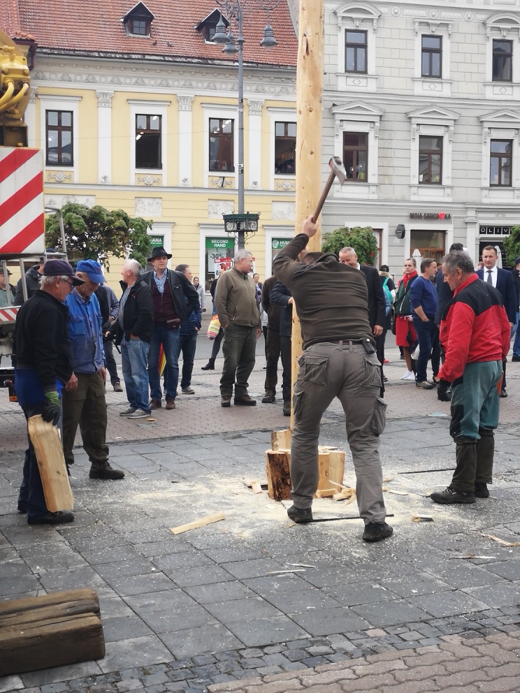 Potom naň Marian Čupka pozval primátora mesta Jána Noska. Ten priniesol symbolickú fľašu slivovice s peniazmi pre stavačov mája, ktorý ležal pod pódiom. Najskôr ho v spolupráci s prvým viceprimátorom Jakubom Gajdošíkom a poslancom Michalom Škantárom ozdobili farebnými stužkami.. Potom ho s tanečníkmi FS Urpín vedenými Petrom Pohančaníkom pomáhali lesníkom s mechanizmom postaviť a upevniť do pripraveného otvoru v dlažbe námestia. Prišla aj poslankyňa Katarína Čižmárová.