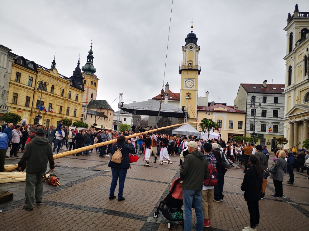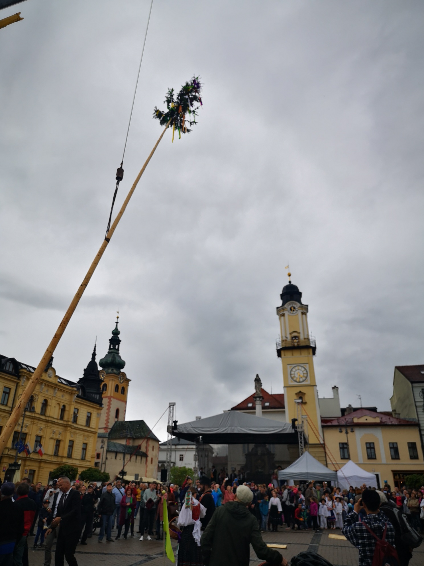 V utorok 30. apríla podvečer sa napriek dažďovým prehánkam zišli na Námestí SNP  folkloristi s pracovníkmi Mestských lesov, aby postavili pripravený máj zo statného smreka. Na pódiu najskôr vystúpil Detský folklórny súbor Prvosienka.