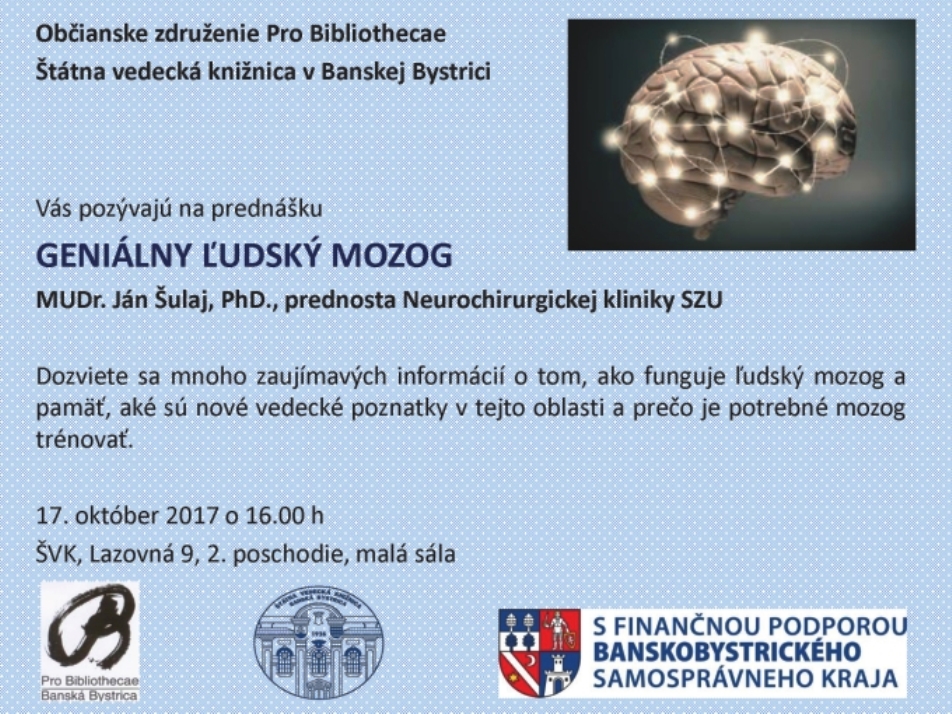 Aj to sú otázky, na ktoré môžete hľadať odpovede s naslovovzatým odborníkom, prednostom Neurochirurgickej kliniky SZU v Banskej Bystrici, MUDr. Jánom Šulajom, PhD. Geniálny ľudský mozog sa uskutoční v Malej sále Štátnej vedeckej knižnice v Banskej Bystrici v utorok 17. októbra 2017 o 16:00 hod.