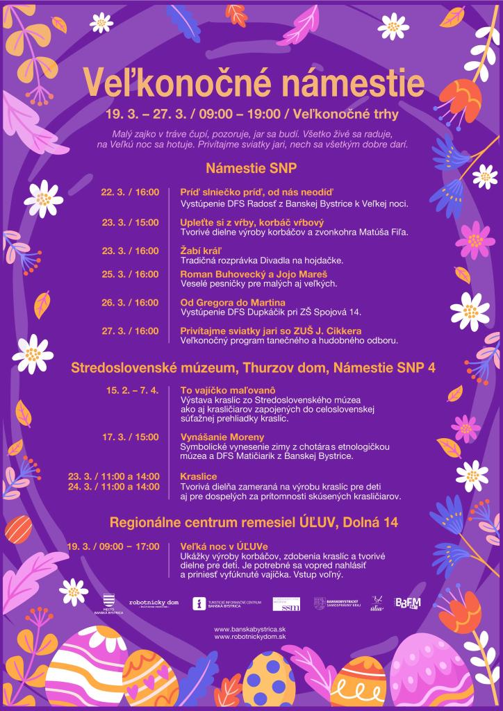 O príjemnú predveľkonočnú atmosféru sa na Námestí SNP postará pestrý program. Detský folklórny súbor Radosť z Banskej Bystrice s programom Príď slniečko príď, od nás neodíď, vystúpi 22. marca o 16:00 hod. O deň neskôr bude Matúš Fiľo od 15:00 hod. učiť malých i veľkých pliesť korbáče z vŕbových prútov.