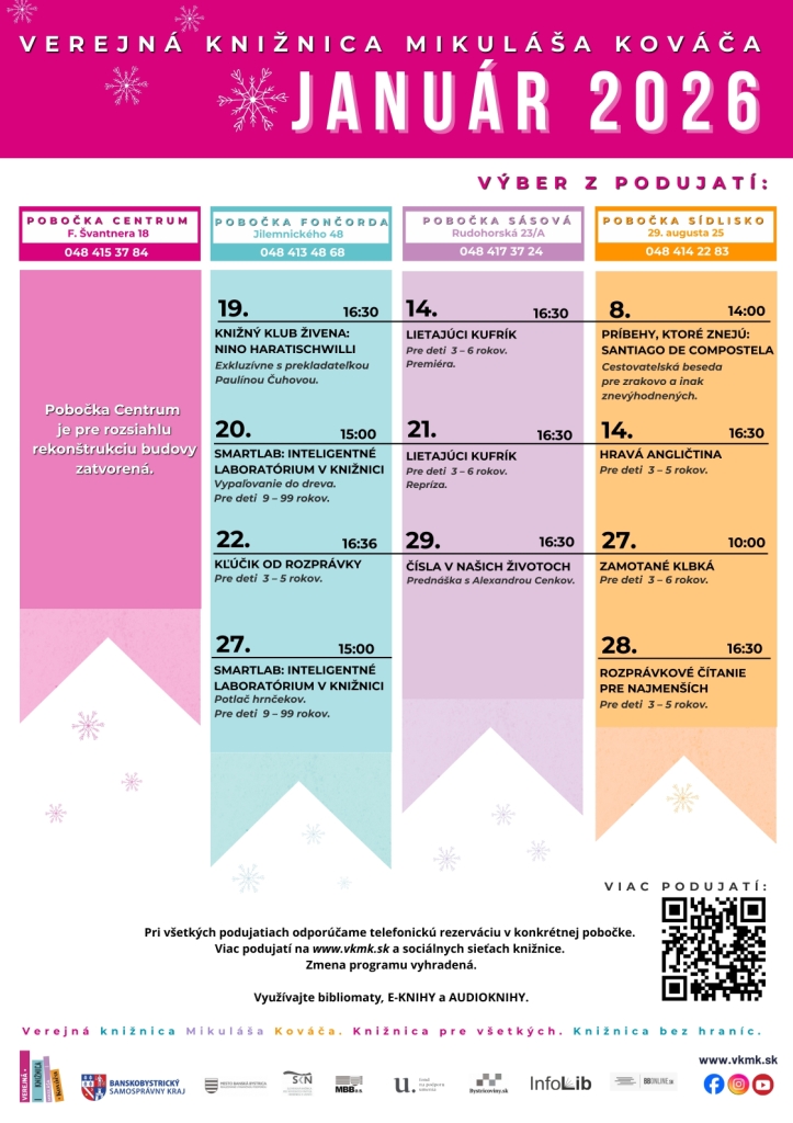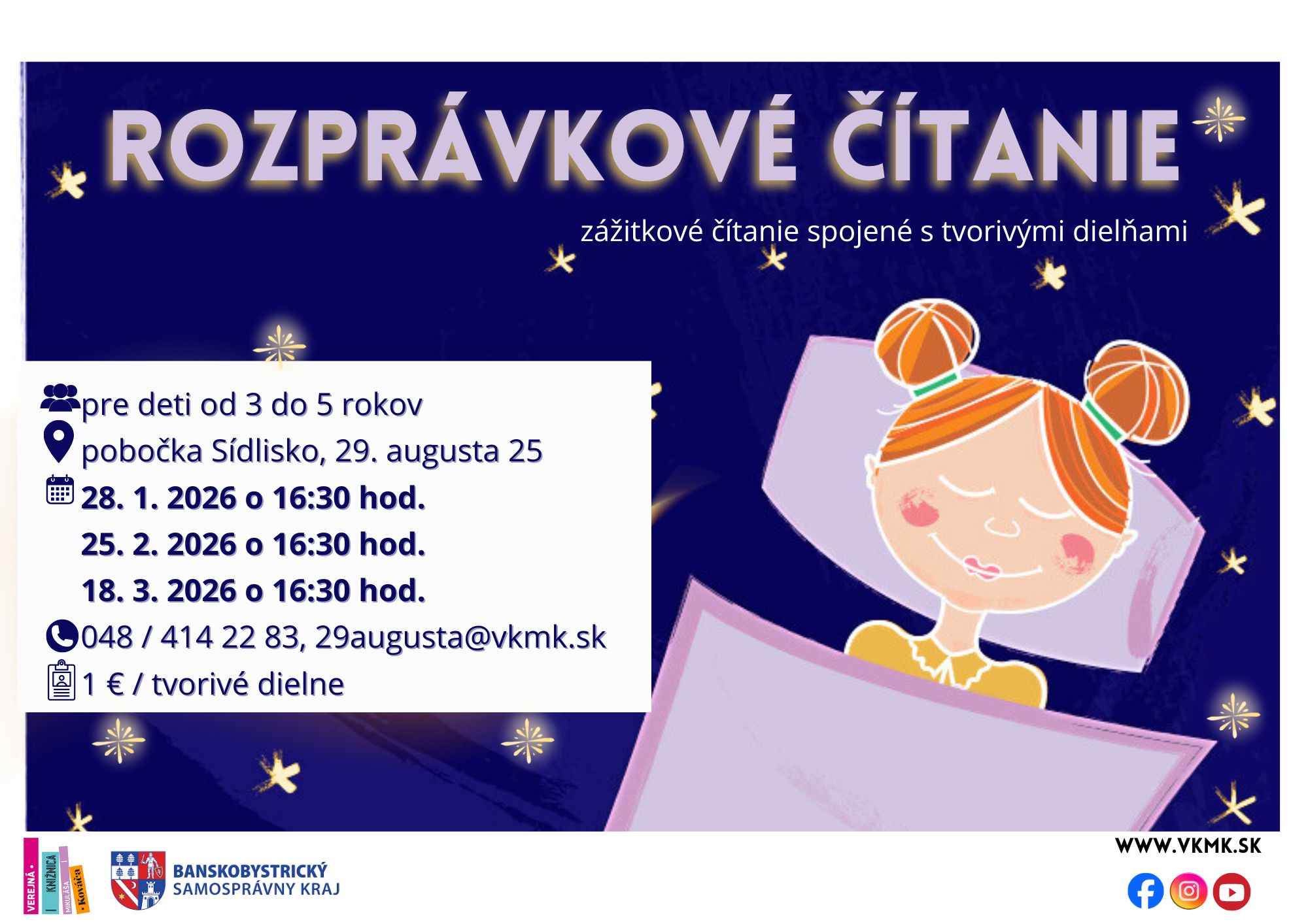 - 28. 1. o 16:30: Rozprávkové čítanie pre najmenších (pob. Sídlisko) – klasické príbehy v interaktívnom podaní.