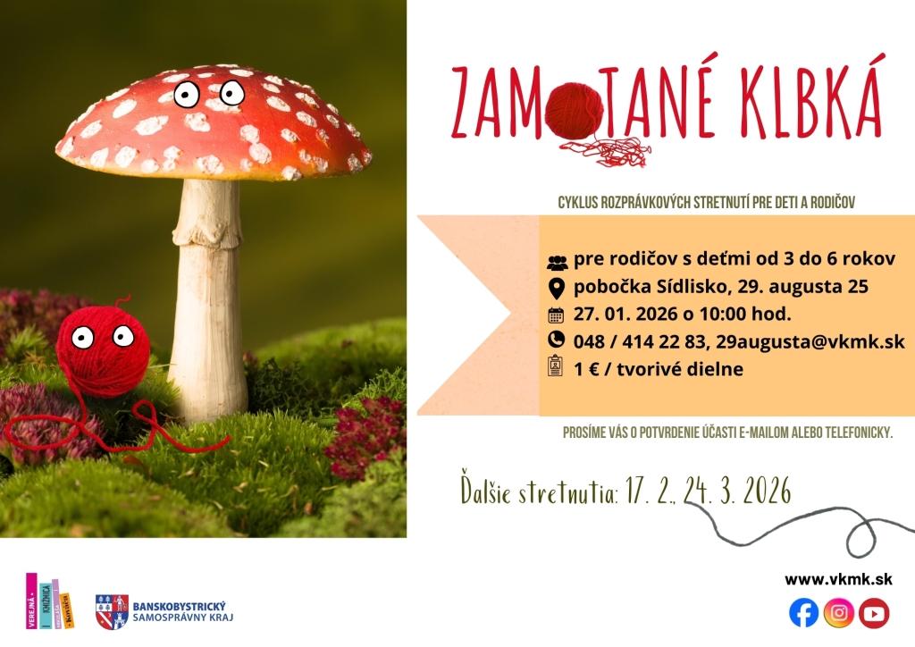 - 27. 1. o 10:00: Zamotané klbká (pob. Sídlisko) – tvorivé čítanie pre jemnú motoriku.