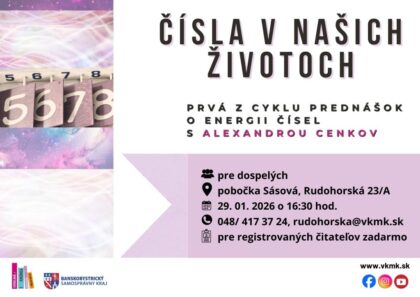 Sériu podujatí pre dospelých doplní prednáška Alexandry Cenkov s názvom „Čísla v našich životoch“. Lektorka návštevníkom priblíži, ako číselné symboly ovplyvňujú naše každodenné rozhodovanie. Podujatie sa uskutoční 29. januára o 16.30 v pobočke Sásová.