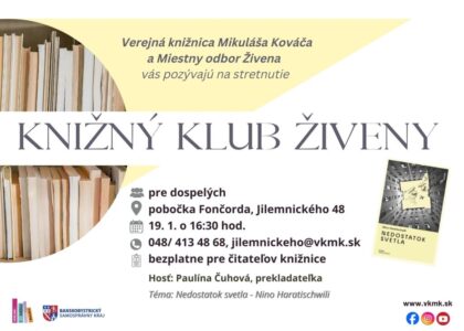 Pre milovníkov kvalitnej prózy pripravila Verejná knižnica Mikuláša Kováča výnimočný večer v rámci Knižného klubu Živena. Pozvanie prijala prekladateľka Paulína Čuhová, ktorá slovenskému čitateľovi sprostredkovala monumentálny román nemecko-gruzínskej autorky Nino Haratischwili Nedostatok svetla.