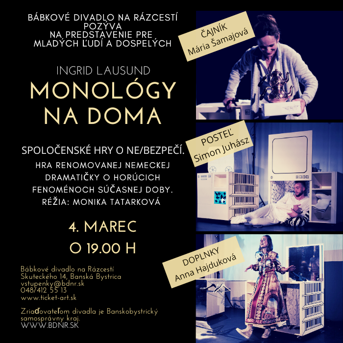 Banskobystrické Bábkové divadlo na Rázcestí si Vás dovoľuje pozvať na ďalší komorný večer do divadelného Teátria. V stredu 4. marca 2020 o 19:00 hod. to bude hra Ingrid Lausand „Monológy na doma“.