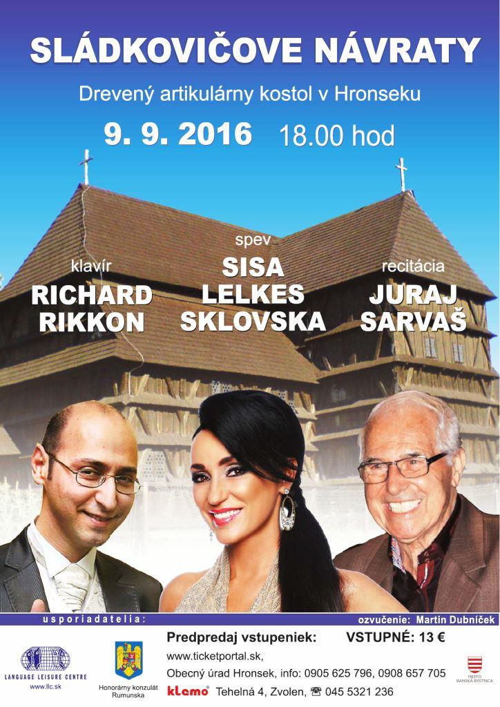Koncert sa uskutoční 9. septembra o 18:00 hod. v drevenom artikulárnom kostole v Hronseku. Vystúpia osobnosti slovenskej hudobnej kultúry – klavirista Richard Rikkon a speváčka Sisy Lelkes Sklovska, so sprievodným slovom majstra recitátora, herca a pedagóga Juraja Sarvaša.