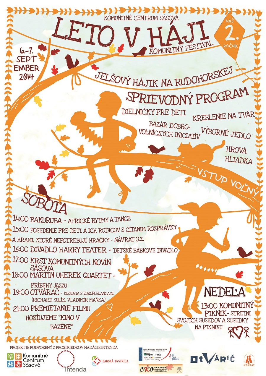 Komunitný festival sa tak, ako po minulé roky, odohrá nad Jelšovým hájikom na Rudohorskej ulici v Sásovej. Druhý ročník prinesie aj novinky v podobe bazára dobrovoľníckych iniciatív, kde sa návštevníci dozvedia o možnostiach dobrovoľníckych aktivít vo svojom okolí. Počas festivalu sa budú krstiť Komunitné noviny Sásová, ktoré prinesú do Banskej Bystrice závan komunitnej žurnalistiky. V nedeľu sa bude piknikovať. Treba si doniesť deku a niečo „fajné“ na zjedenie.